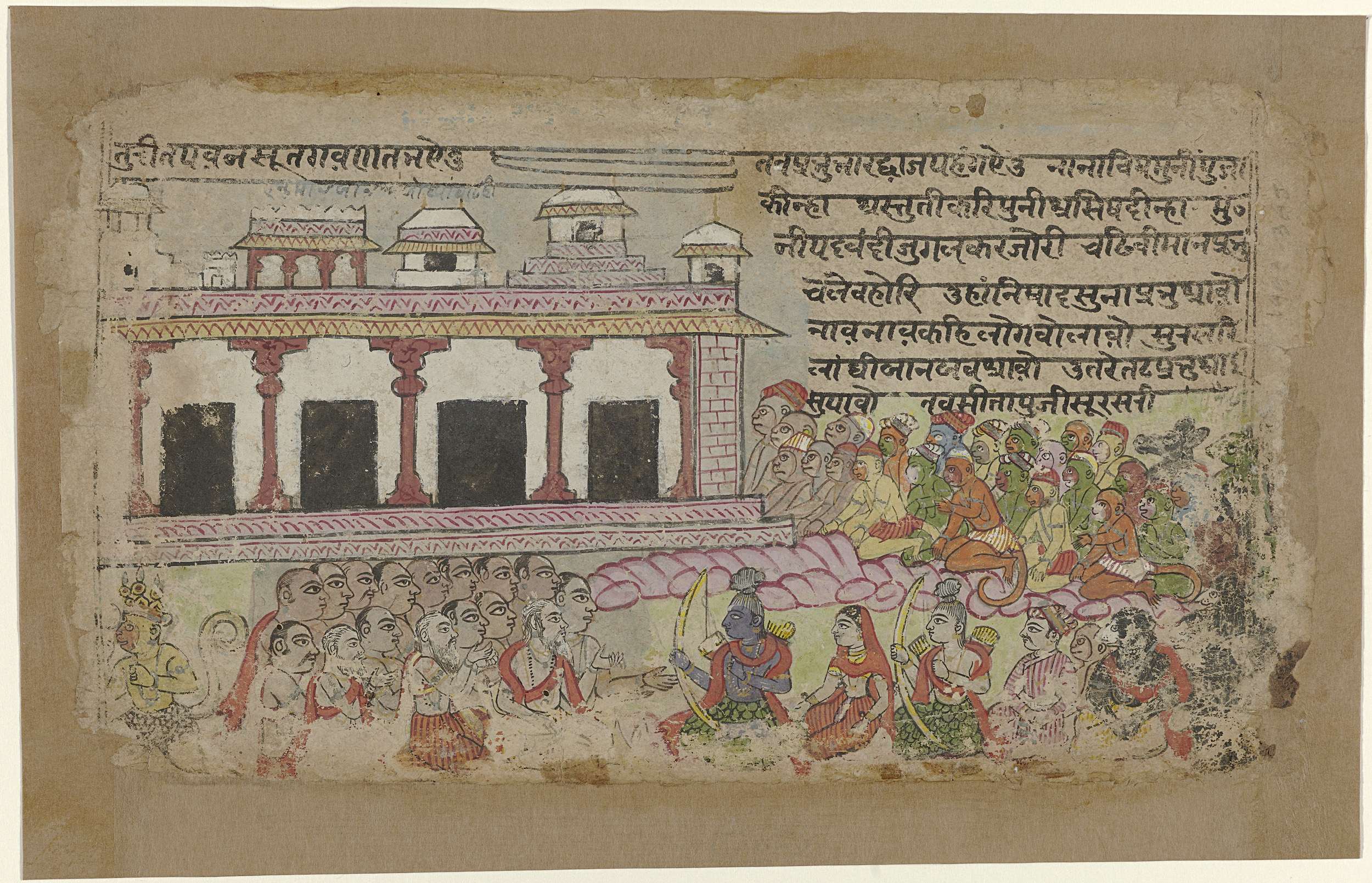 Koning Rama en zijn vrouw Sita gezeten op een troon voor een paleis, rondom hen legers van soldaten en apen. Rechtsboven een tekst in Hindi, linksboven een enkele regel tekst.