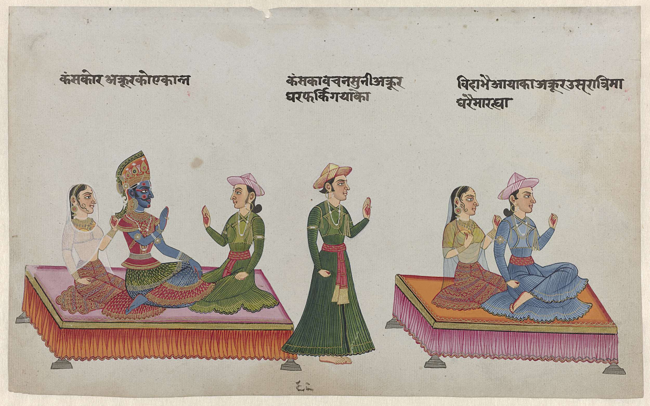 Koning Kamsa zit links op een taboeret met Akrura, een derde figuur zit met zijn gezicht naar het paar, op een kleinere taboeret rechts zit een ander paar, tussen de twee taboeretten staat dezelfde man als de zittende figuur bij Kamsa, maar nu is zijn gezicht in tegenovergestelde richting gekeerd en loopt hij van het ...