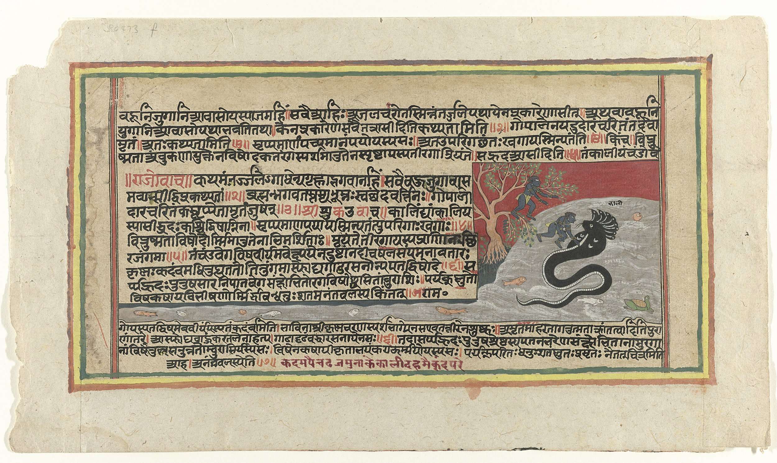 Dit blad gaat over een verhaal uit de Bhagavatapurana, een oude tekst over Krishna’s kinderjaren. Krishna is twee keer afgebeeld. Bovenop de boom bereidt hij zich voor om te vechten tegen Kaliya, een zwarte slang die de rivier Yamuna vergiftigt. Hij springt vervolgens in het water en start daarmee de strijd. De Yamuna is de ...