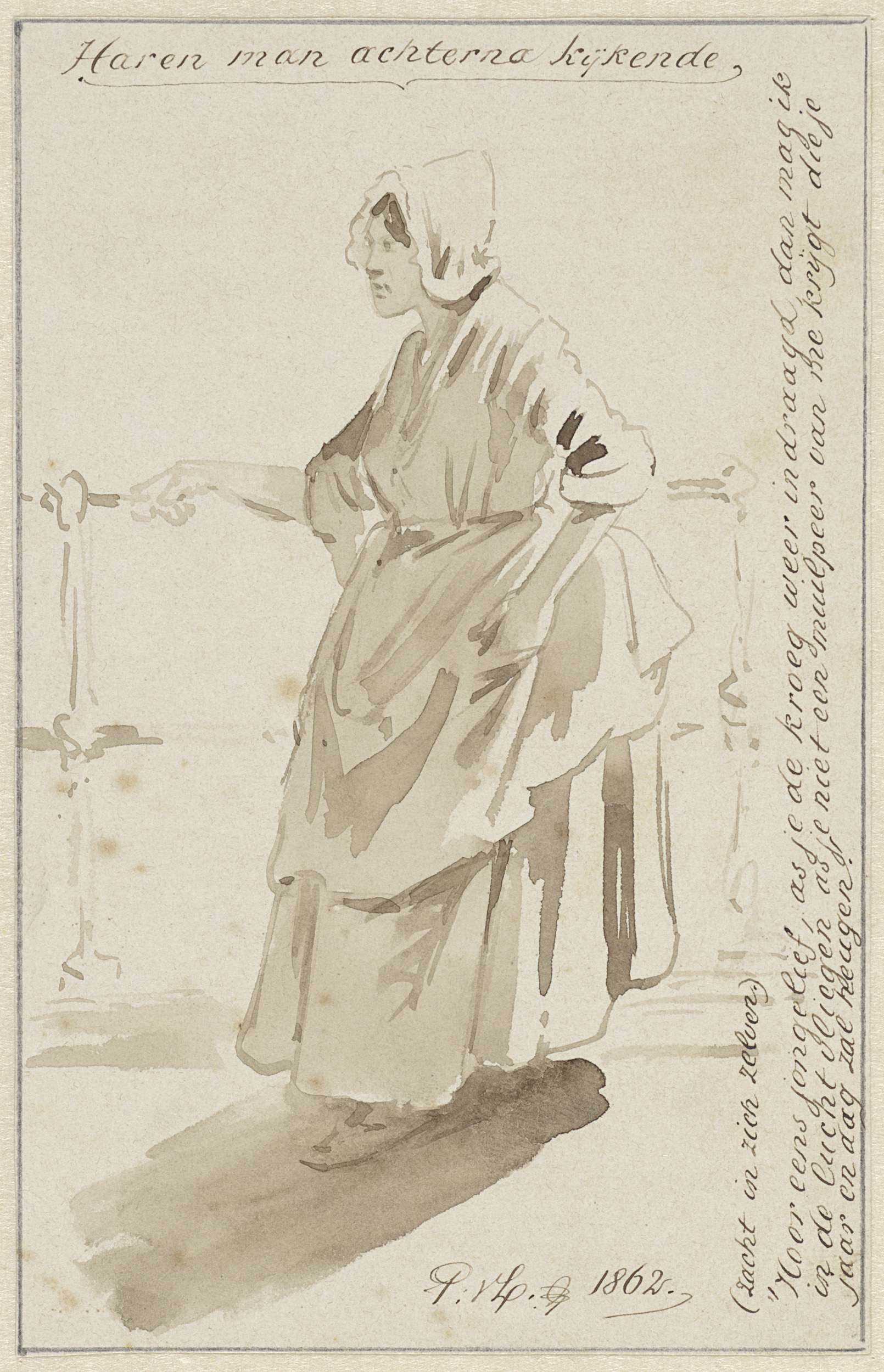 Karikatuur van een vrouw die haar man nakijkt; rechts een bijschrift. Op verso de Franse vertaling van het op- en bijschrift op recto.
