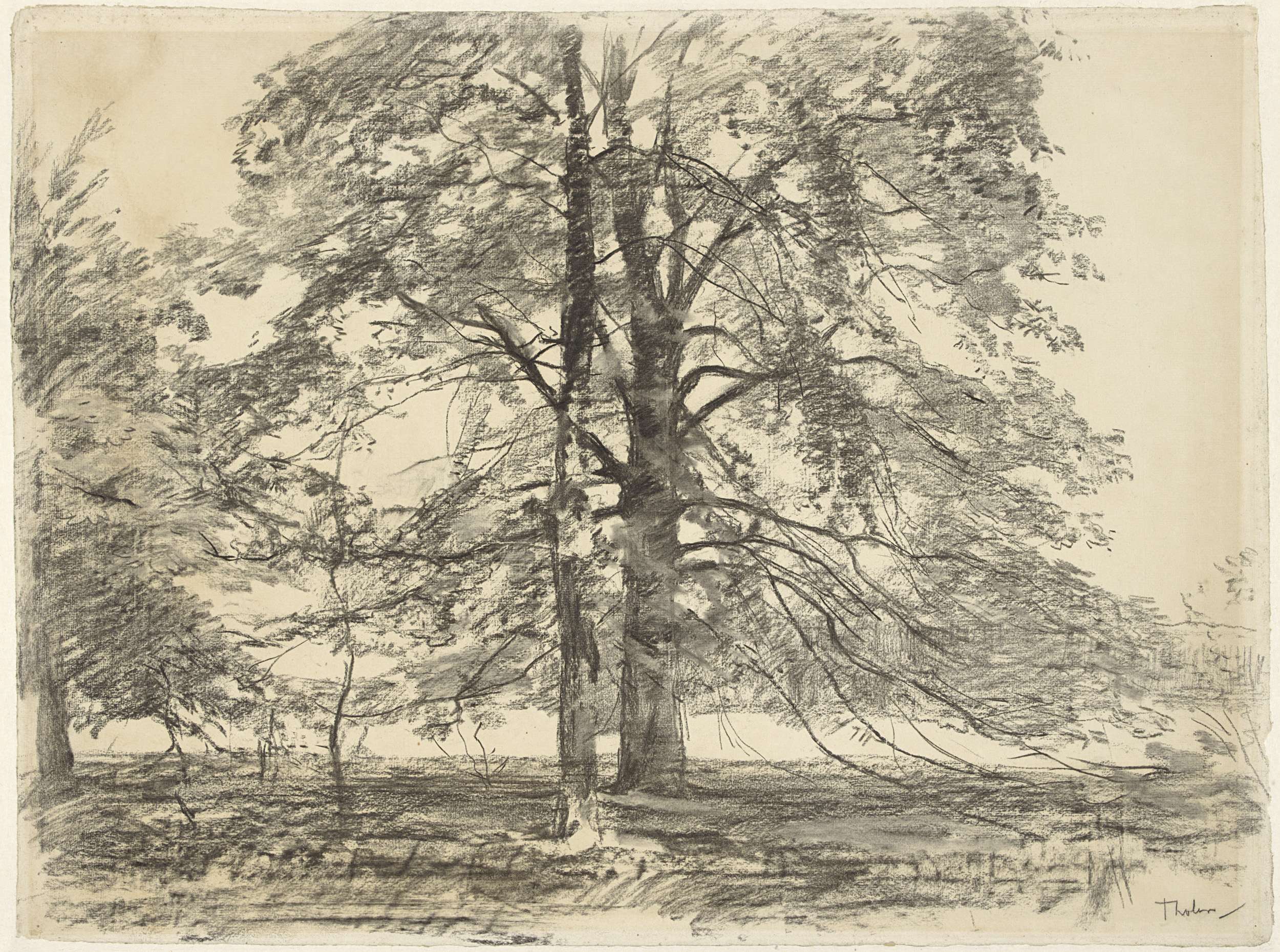 Hoge bomen in een vlak landschap
