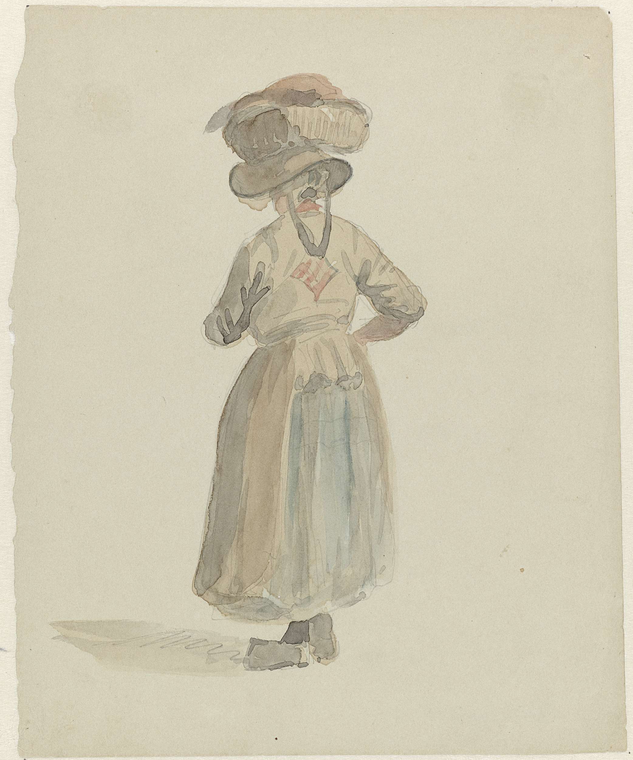 Figuurstudie van een op de rug geziene staande vrouw met een mand met waar op het hoofd.