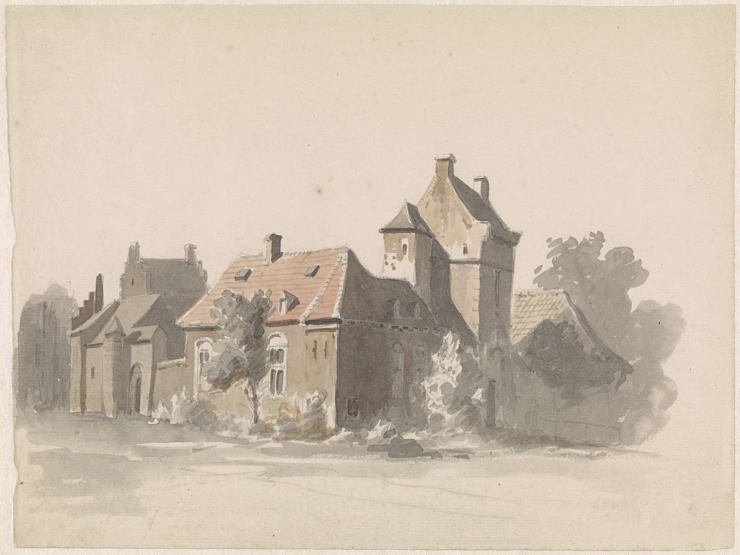 Gezicht op een groep huizen met stadspoortje(?)