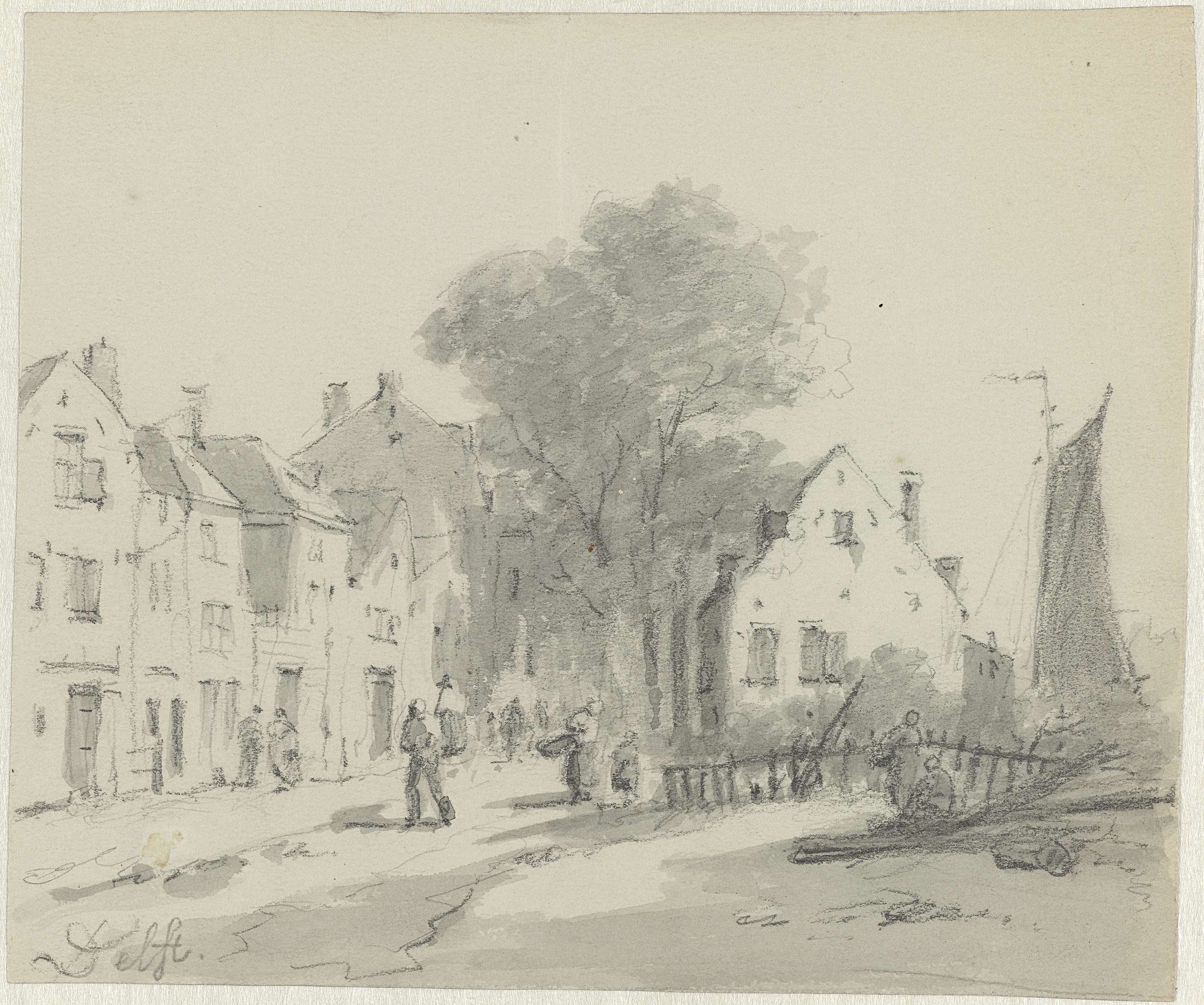 Gezicht op huizen aan de rand van Delft, rechts een vaart