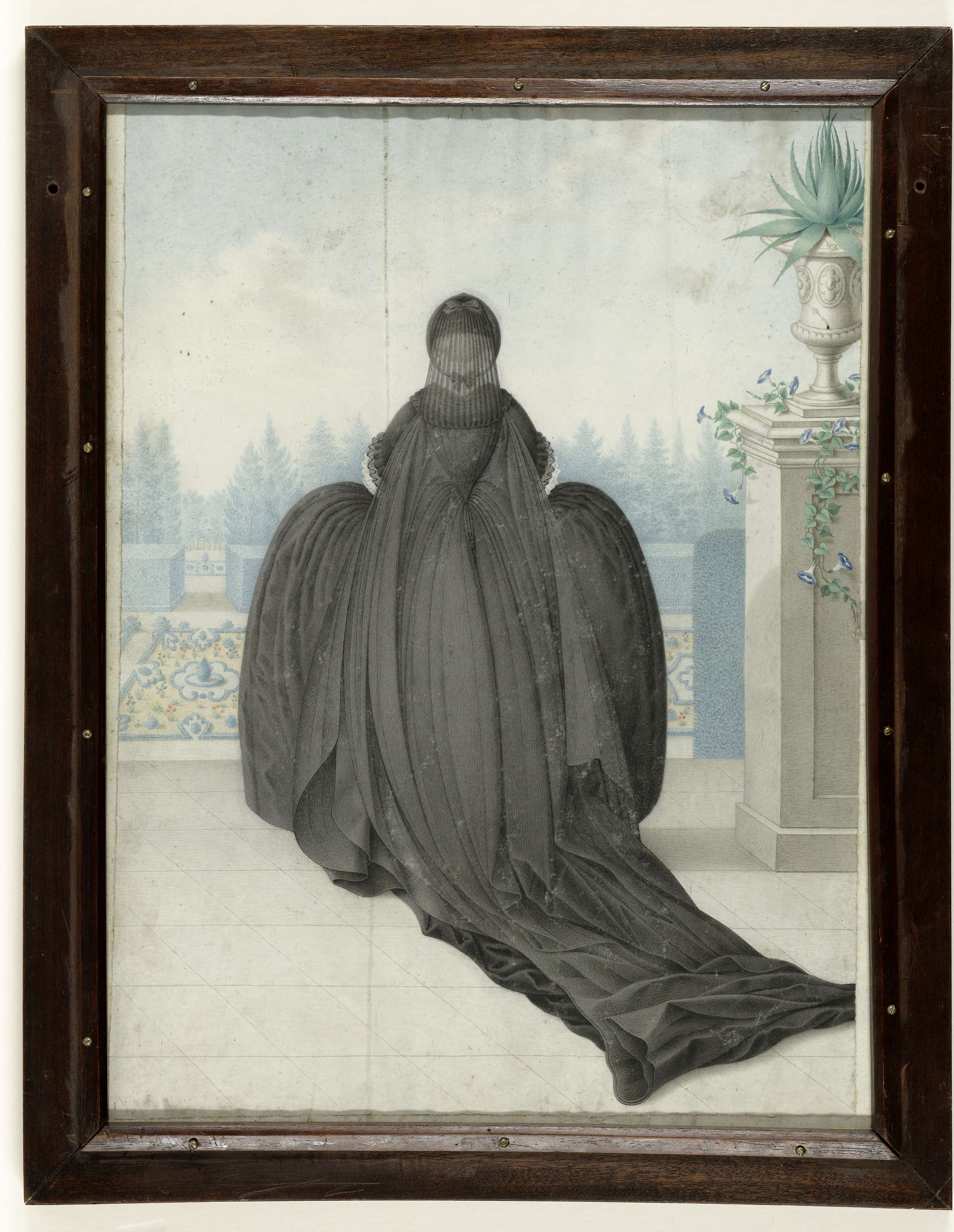 Het is onduidelijk of keizerin Maria Theresia (1717-1780) hier uitkijkt over de tuinen van zomerresidentie Schönbrunn, dat in haar regeerperiode gestalte kreeg. Ze draagt rouwkleding vanwege de dood van haar echtgenoot Frans van Lotharingen in 1765. Ignaz Manzador was een Weense miniatuurschilder. Het doorschijnende karakter van perkament heeft hij benadrukt door voor een tweezijdige voorstelling ...