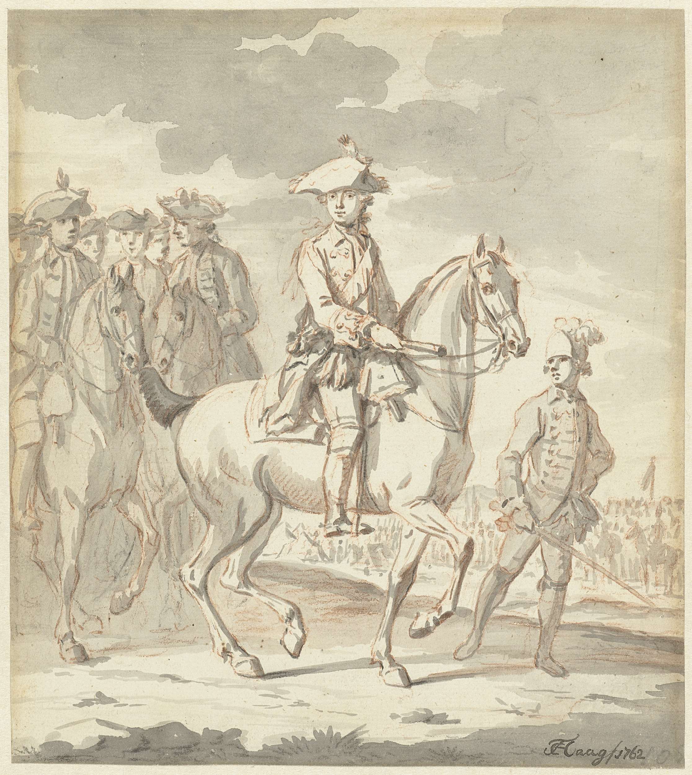 De jonge Prins Willem V te paard, met gevolg