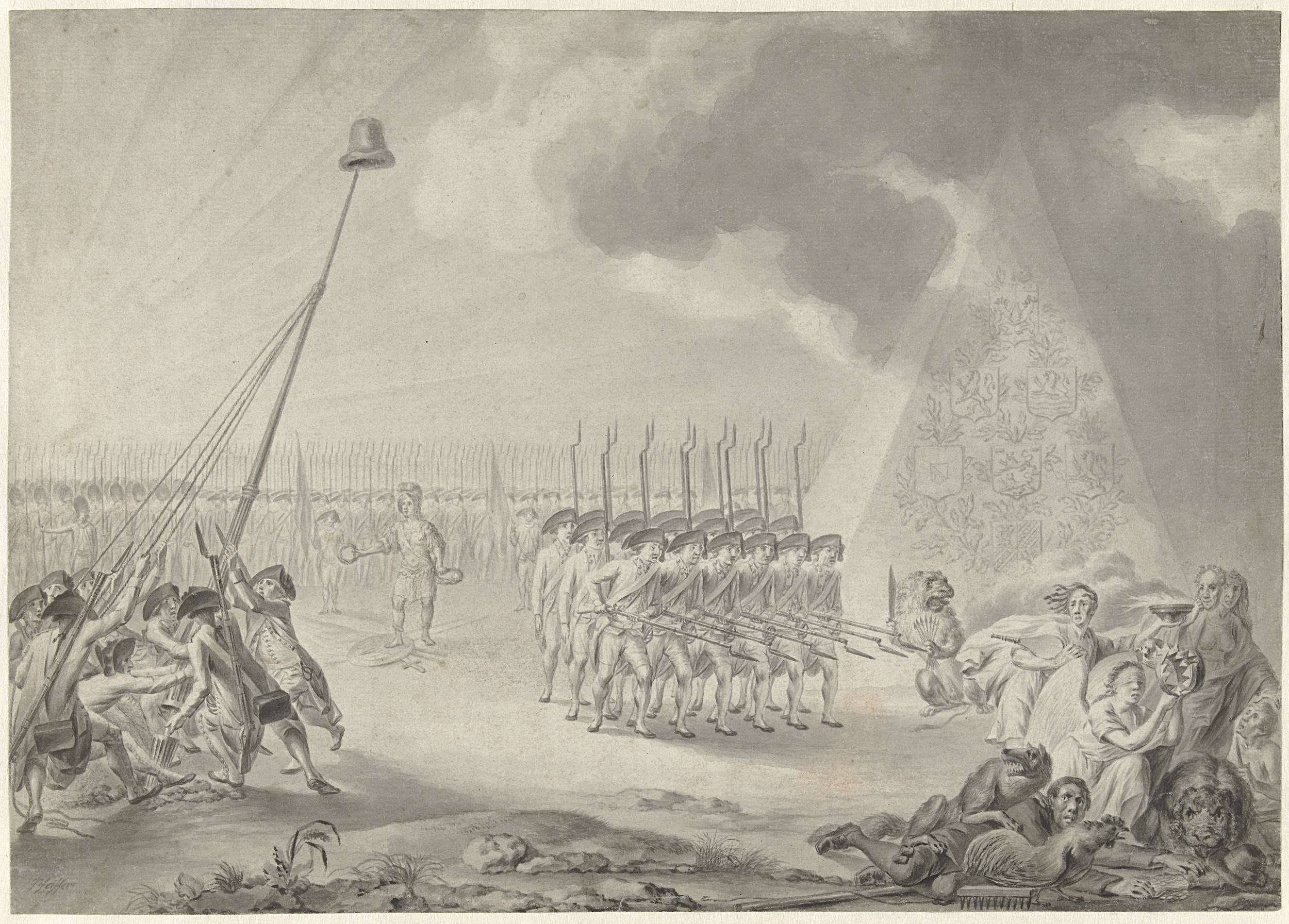 Een corps Patriotten trekt op, voorbij een piramide met de wapens der Zeven provinciën, en verjaagt monsters als Tweedracht en Verraad. Ontwerp voor een historieprent.