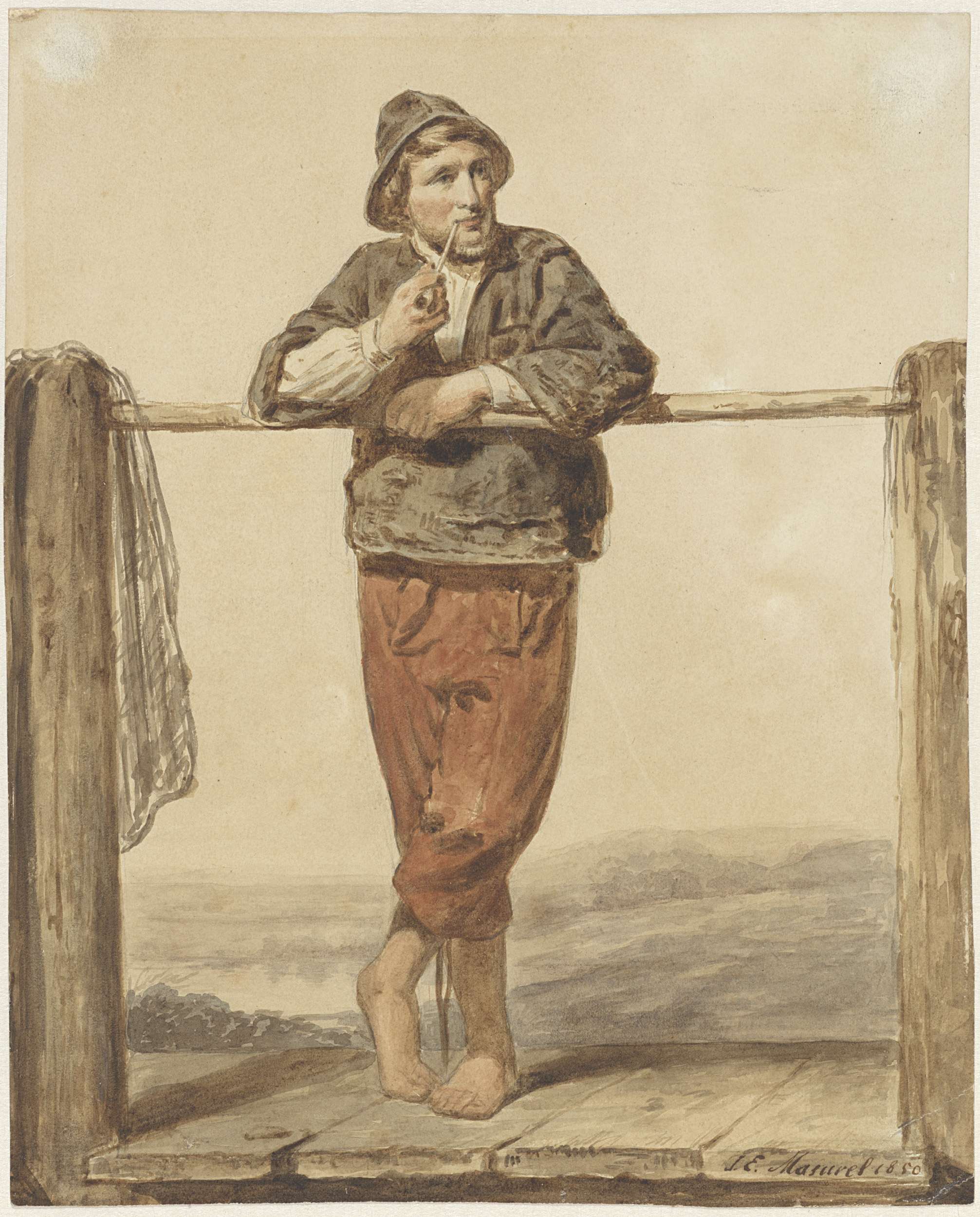 Pijprokende, staande man met zuidwester, de armen op een houten leuning van een houten vlonder, linkerbeen over het rechter geslagen, van voren, met hoofd enigszins naar rechts; op de achtergrond een rivierlandschap; over de ronde kop van de paal links vooraan hangt een (net?)doek.