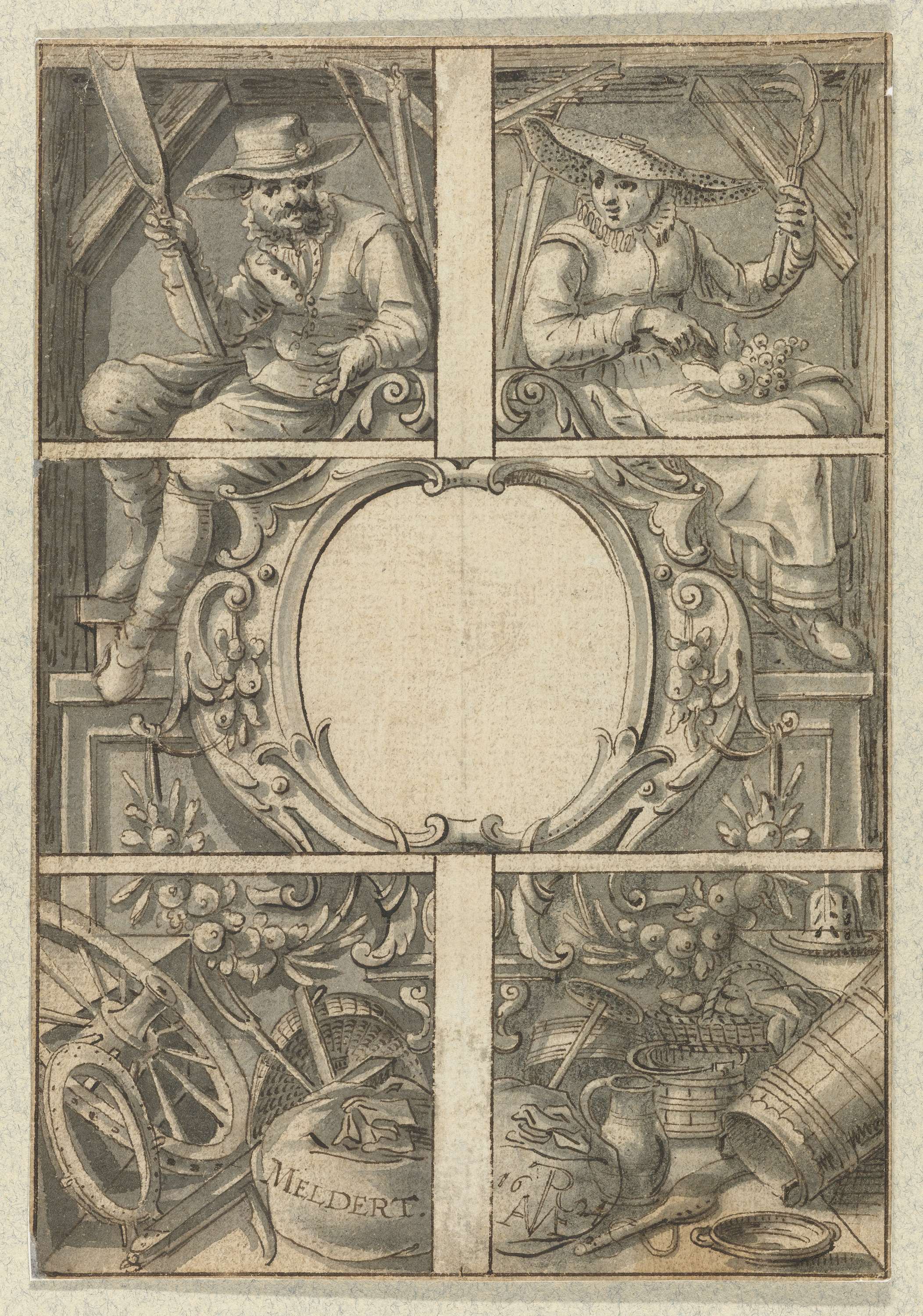 Links zit een boer met een dorsvlegel en een zeis en naast hem en een boerin met een sikkel en een schoffel. De verdeling van verticale en twee horizontale banen suggereert dat de tekening als ontwerp voor een glas-in-loodraam diende. Van de in Zeeland werkzame glasschilder Pieter van Meldert is dit het enige bekende werk. ...