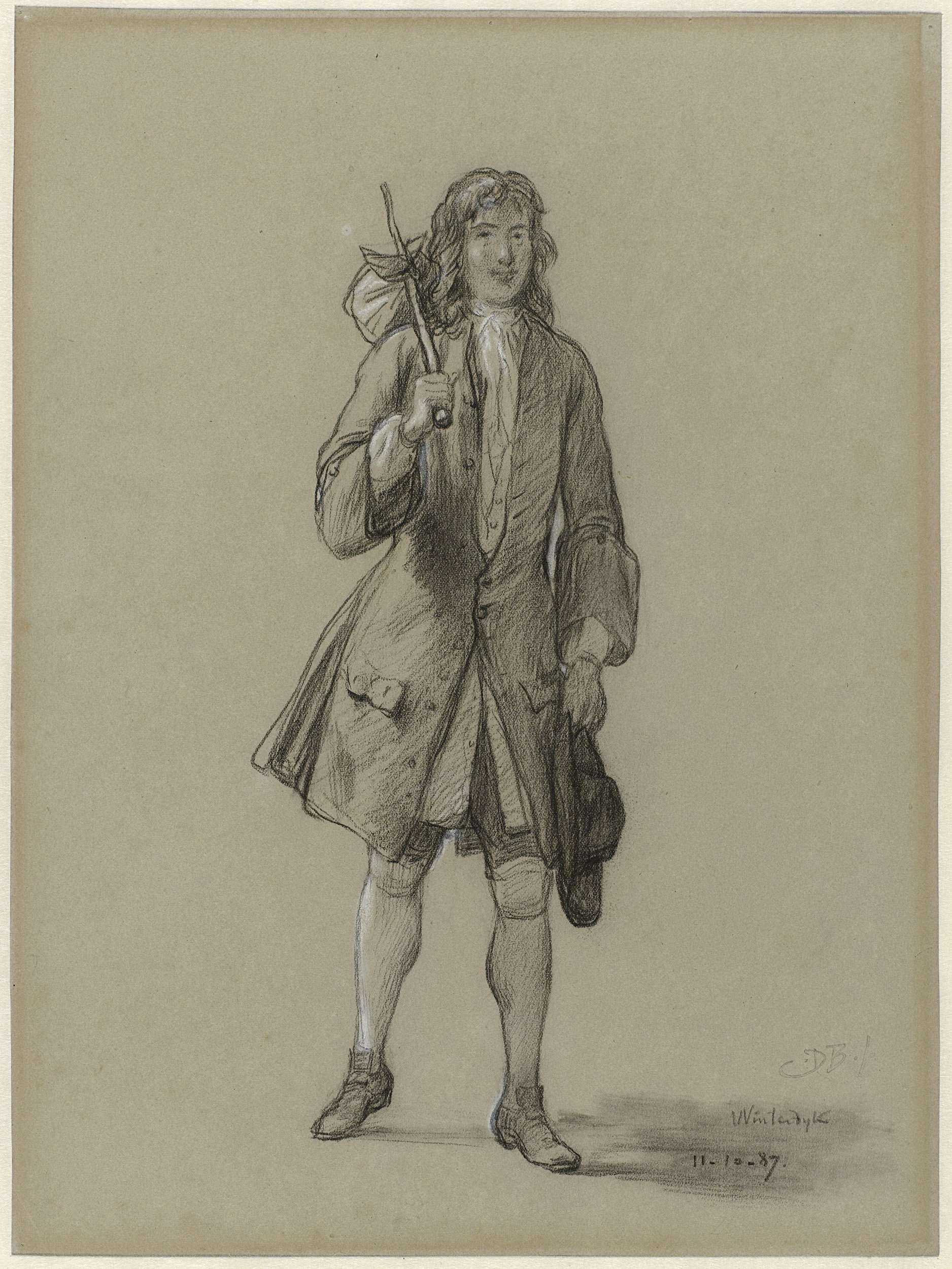 Een jonge man in 18e eeuws kostuum, een knapzak over deschouder. Figuurstudie voor de eerste illustratie in de prachtuitgave van Jacob van Lennep's Ferdinand Huyck, Leiden z.j.