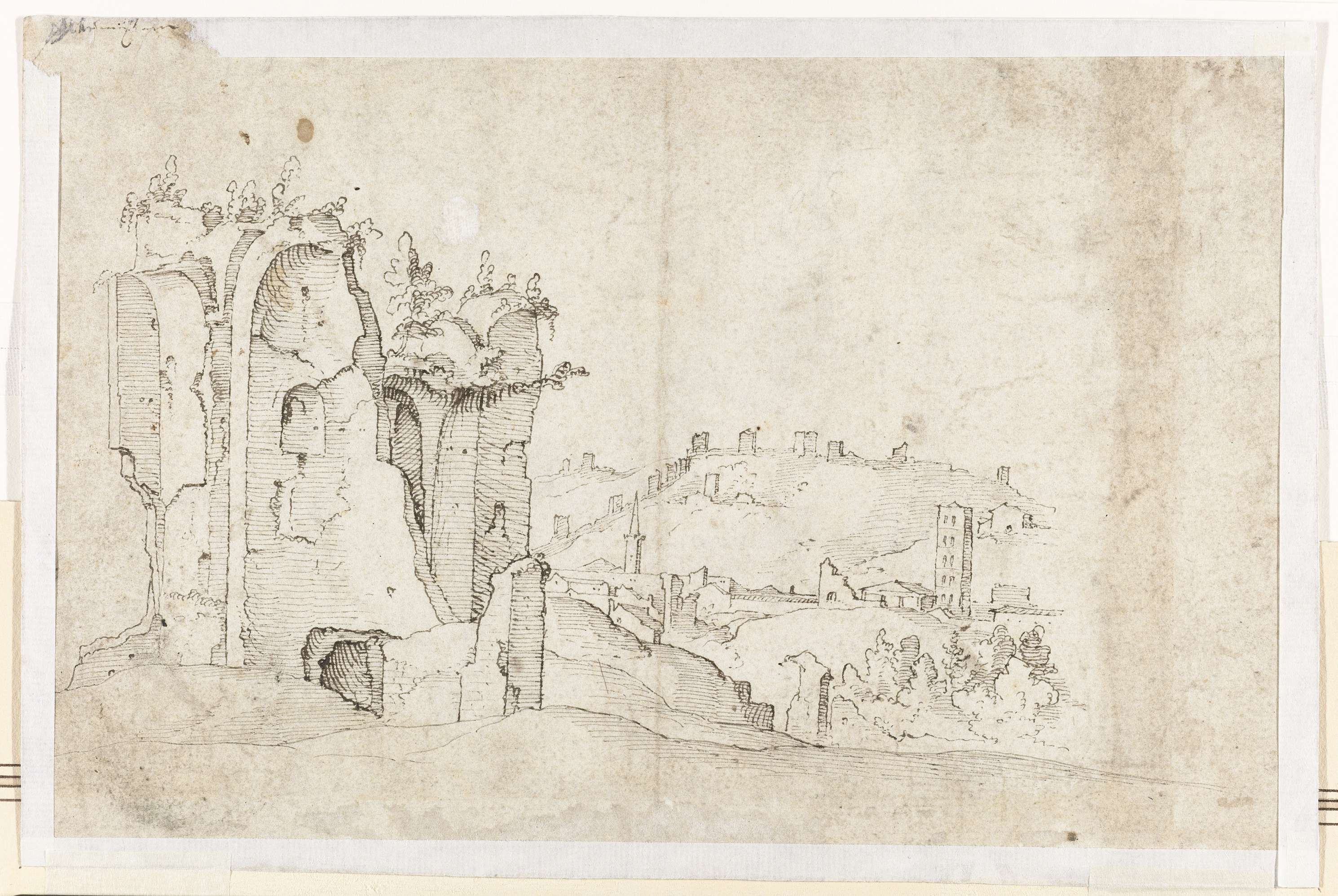 Een ongeïdentificeerde ruïne in Rome; op de achtergrond een deel van de Romeinse stadsmuur