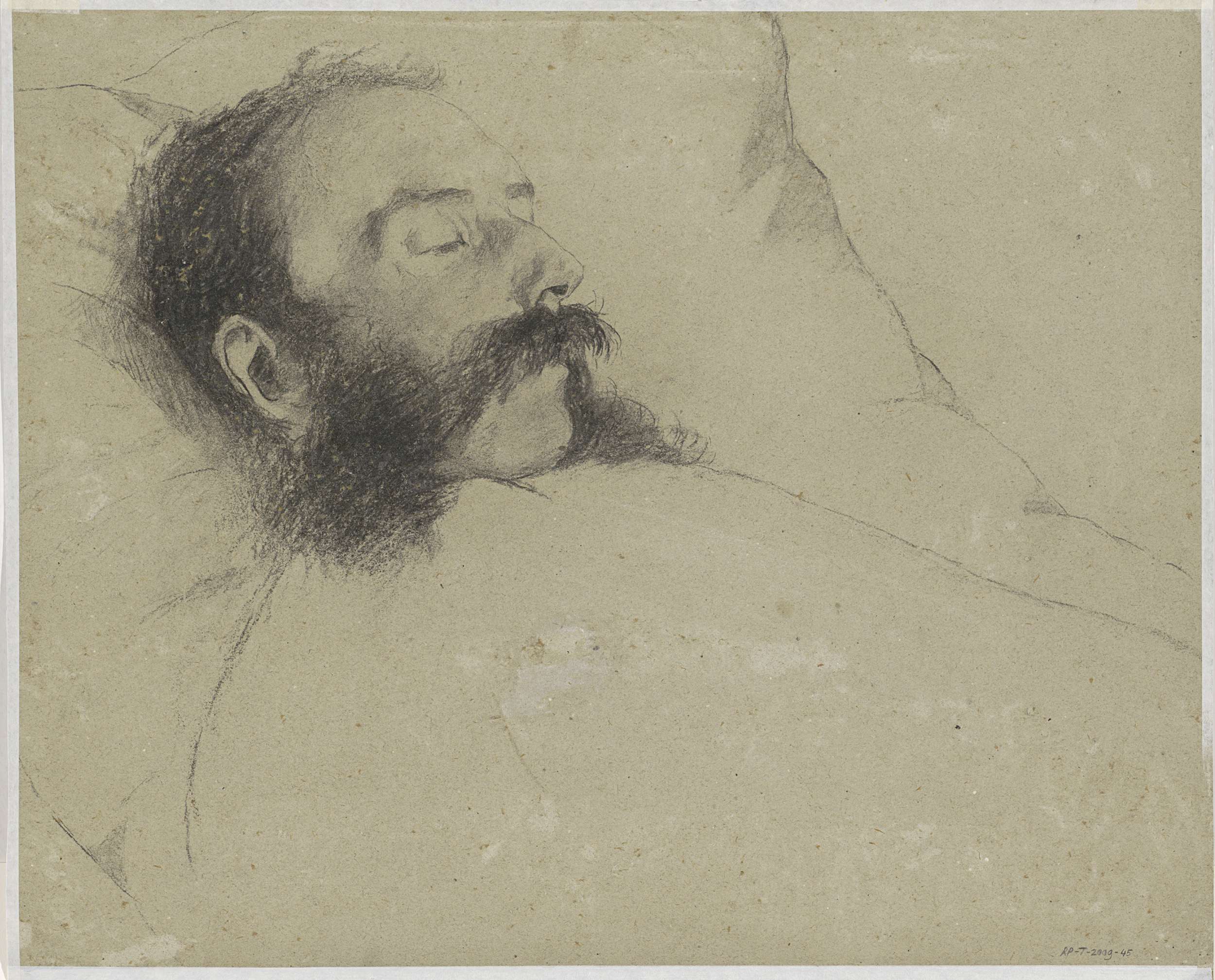 Portret van een rustende/ gestorven man op bed
