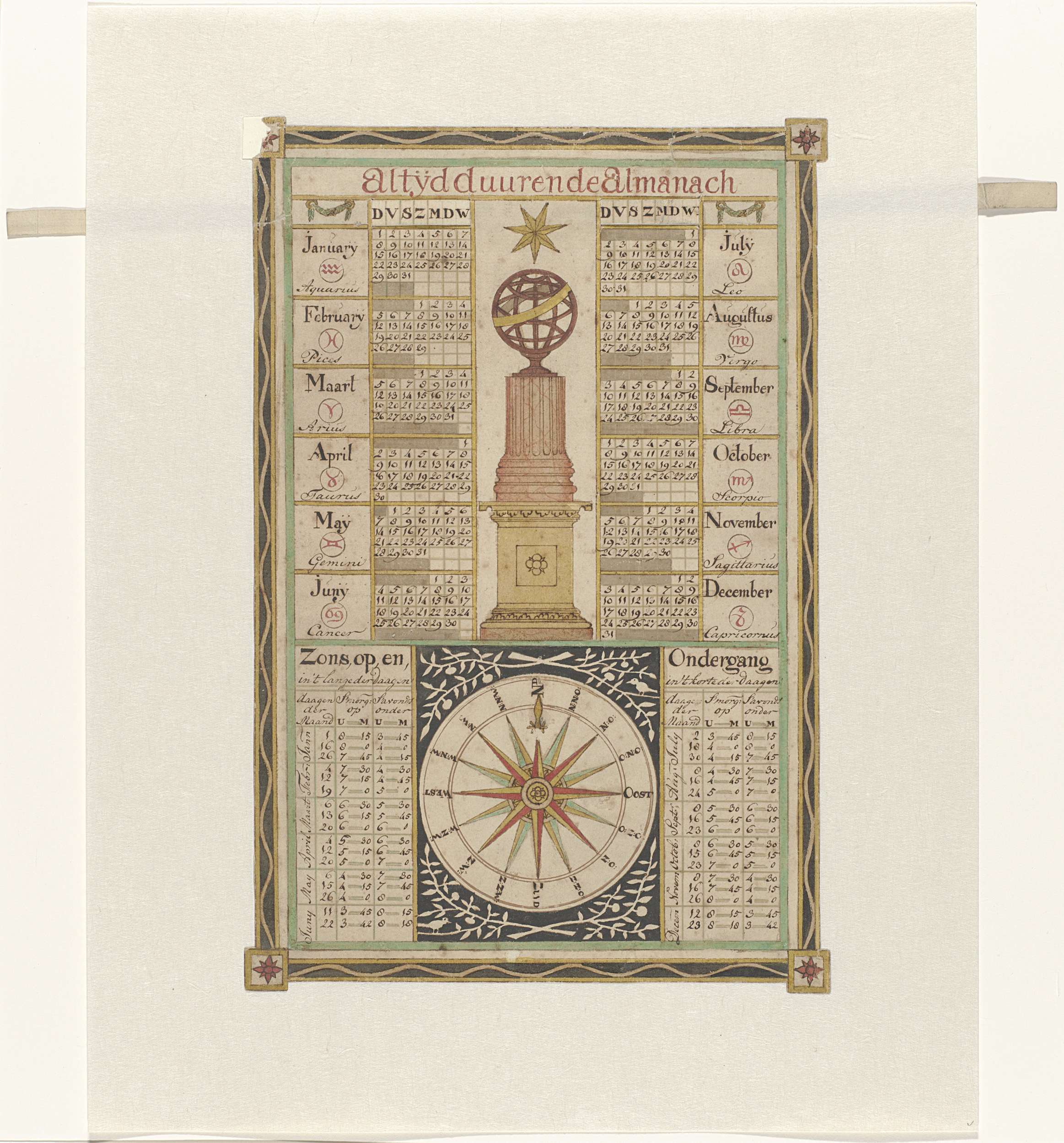 Kalender met aan linker- en rechterkant de namen van de zes maanden en de sterrenbeelden onder elkaar gegroepeerd. Daartussen bevindt zich een globe op een halve zuil. Bovenaan een verschuifbare strook met tweemaal de dagen van de week. Onder de maanden is een tabel met de zonsop- en -ondergangen gegroepeerd in het korten en langen ...