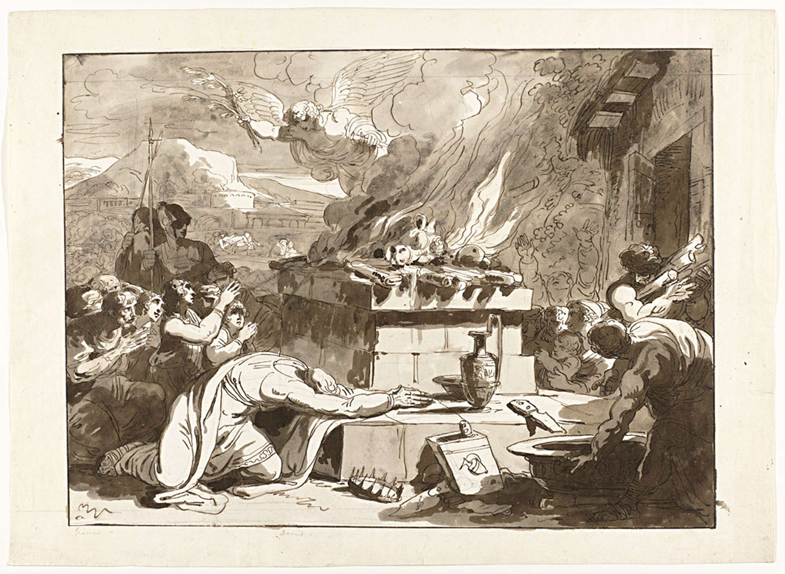 Felice Giani was een productief schilder die vertrekken decoreerde met kleurrijke historietaferelen. Deze tekening is waarschijnlijk in opdracht gemaakt. Neoclassicistisch georiënteerde kunstenaars kozen als onderwerpen vrijwel nooit taferelen uit het Oude Testament. Weergegeven is hoe God zich via een engel met een olijftak na lange tijd verzoent met koning David tijdens een offer. Er is ...
