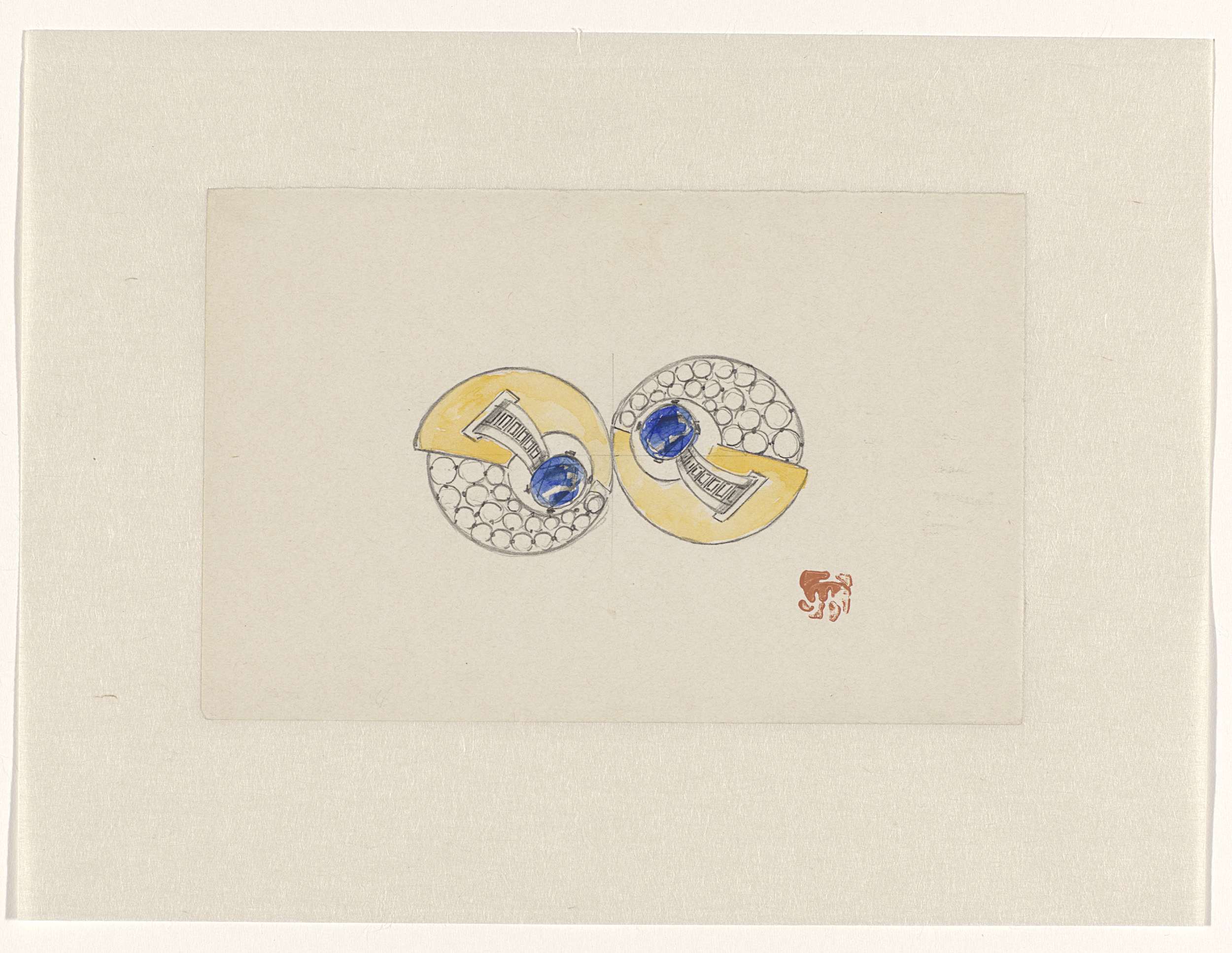 Ontwerp voor juweel, opgebouwd uit twee ronde helften, met goud, saffieren en briljanten