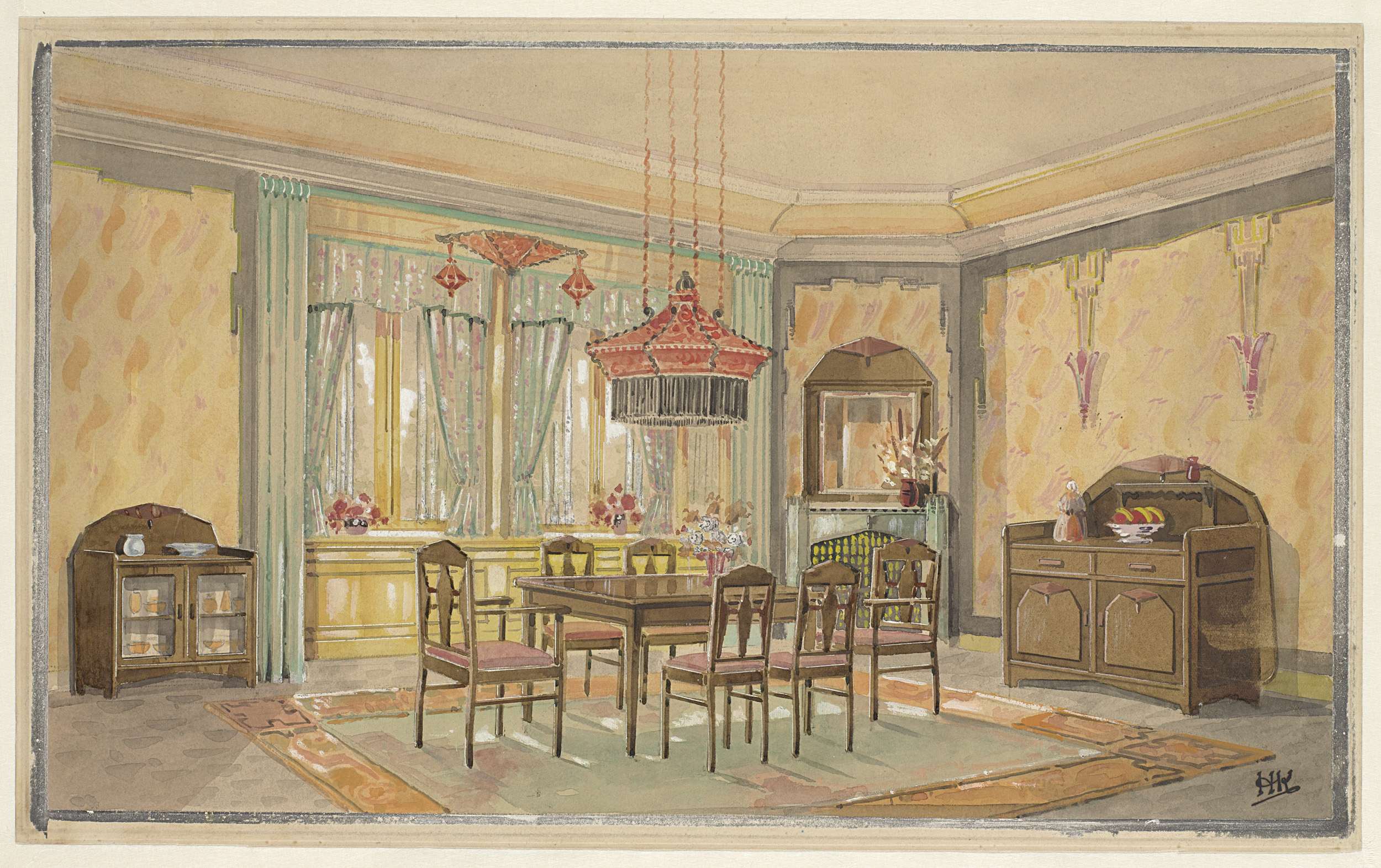 Eetkamer met gele wanden en rode lamp