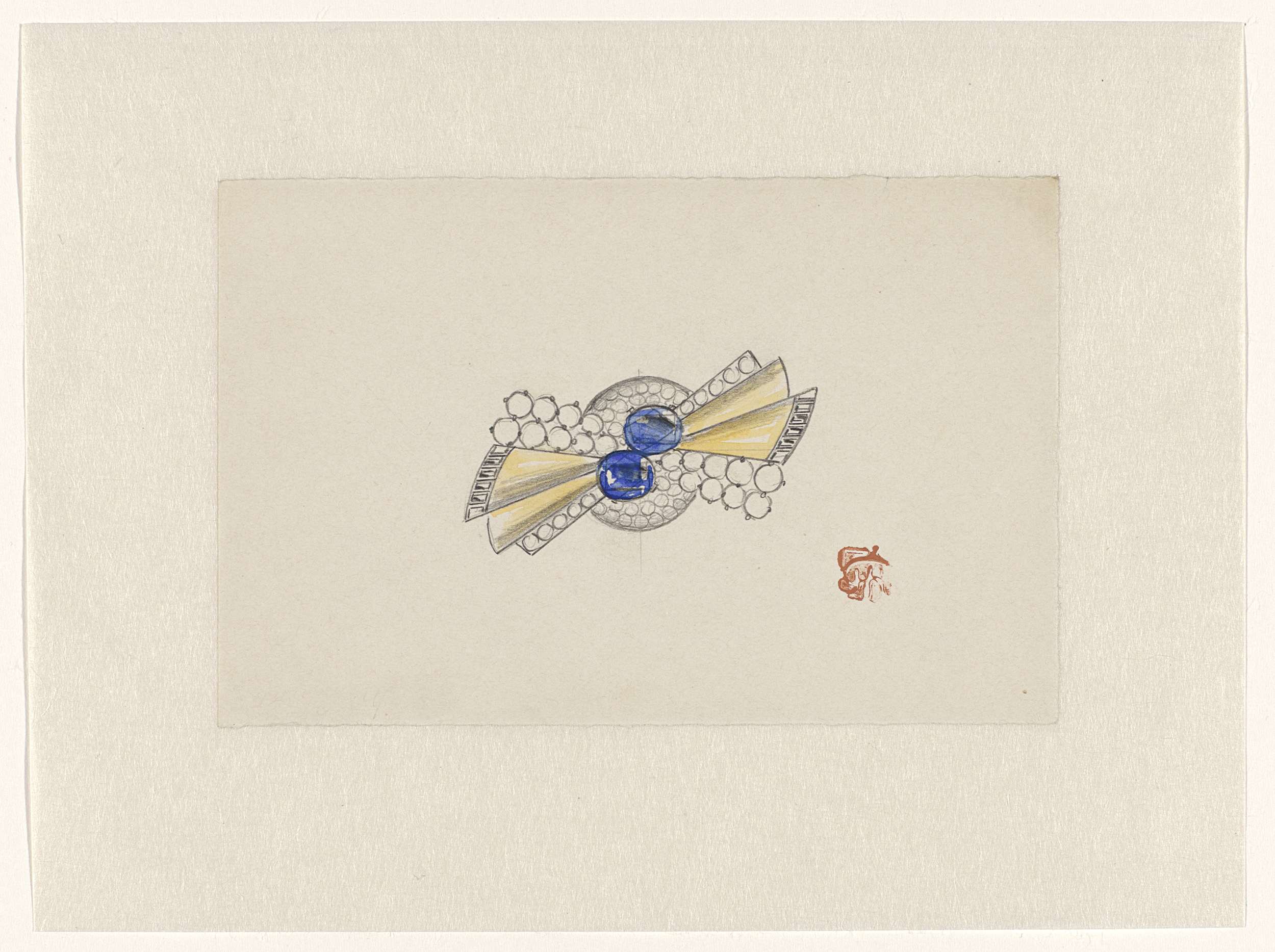 Ontwerp voor een rond juweel met stralen, met goud, saffieren en briljanten