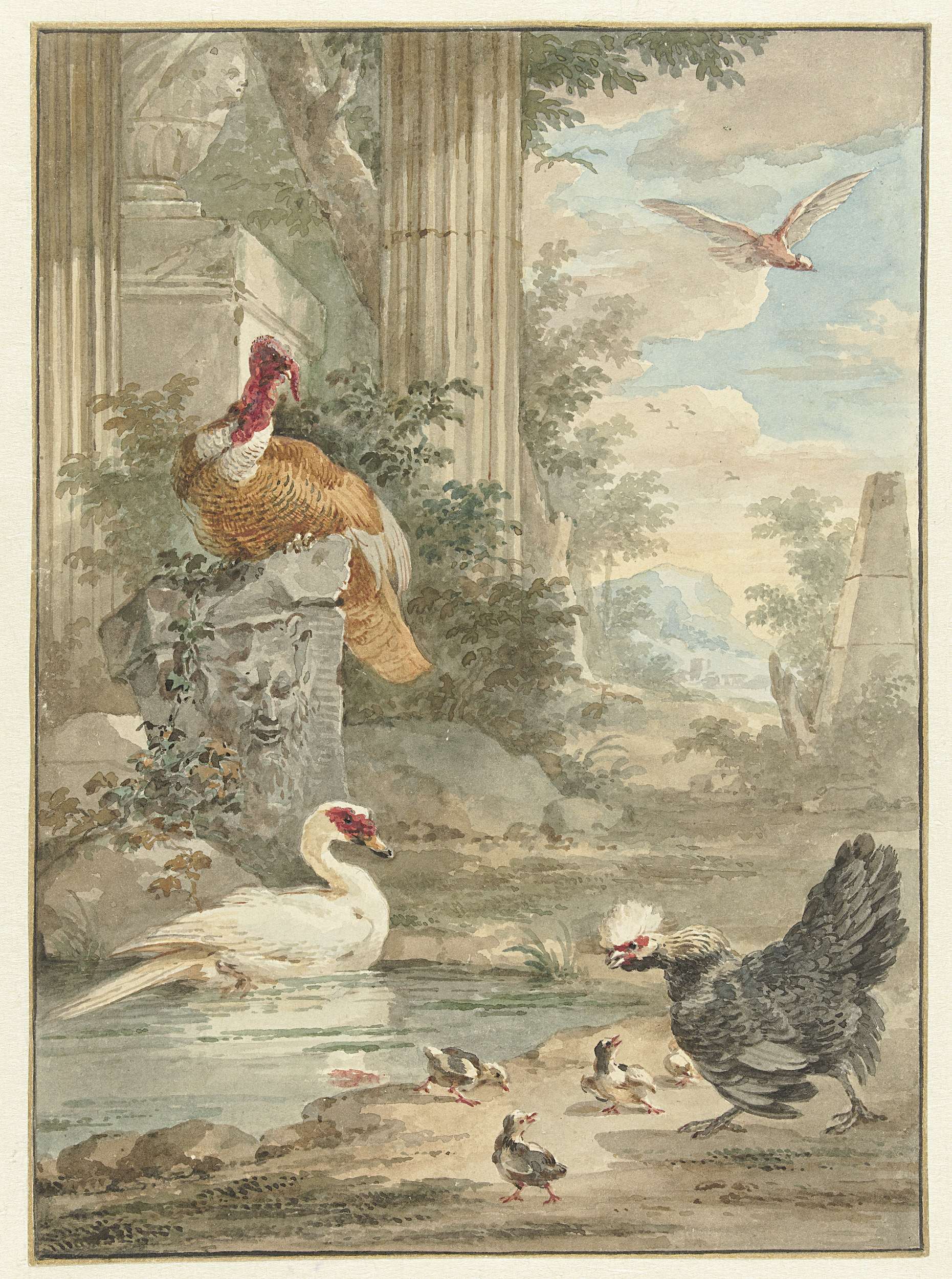 Aert Schouman schilderde niet alleen exotische vogels. In deze tekening koos hij voor echte Nederlandse exemplaren, zoals de witte Muskuseend, de zwarte Kuifhen en de bruine kalkoen. Hij plaatste ze in een toepasselijke omgeving, een door de mens aangelegd park. Deze voorstellingen waren in de 18de eeuw erg geliefd als kamer- of zaalschildering. Mogelijk diende ...