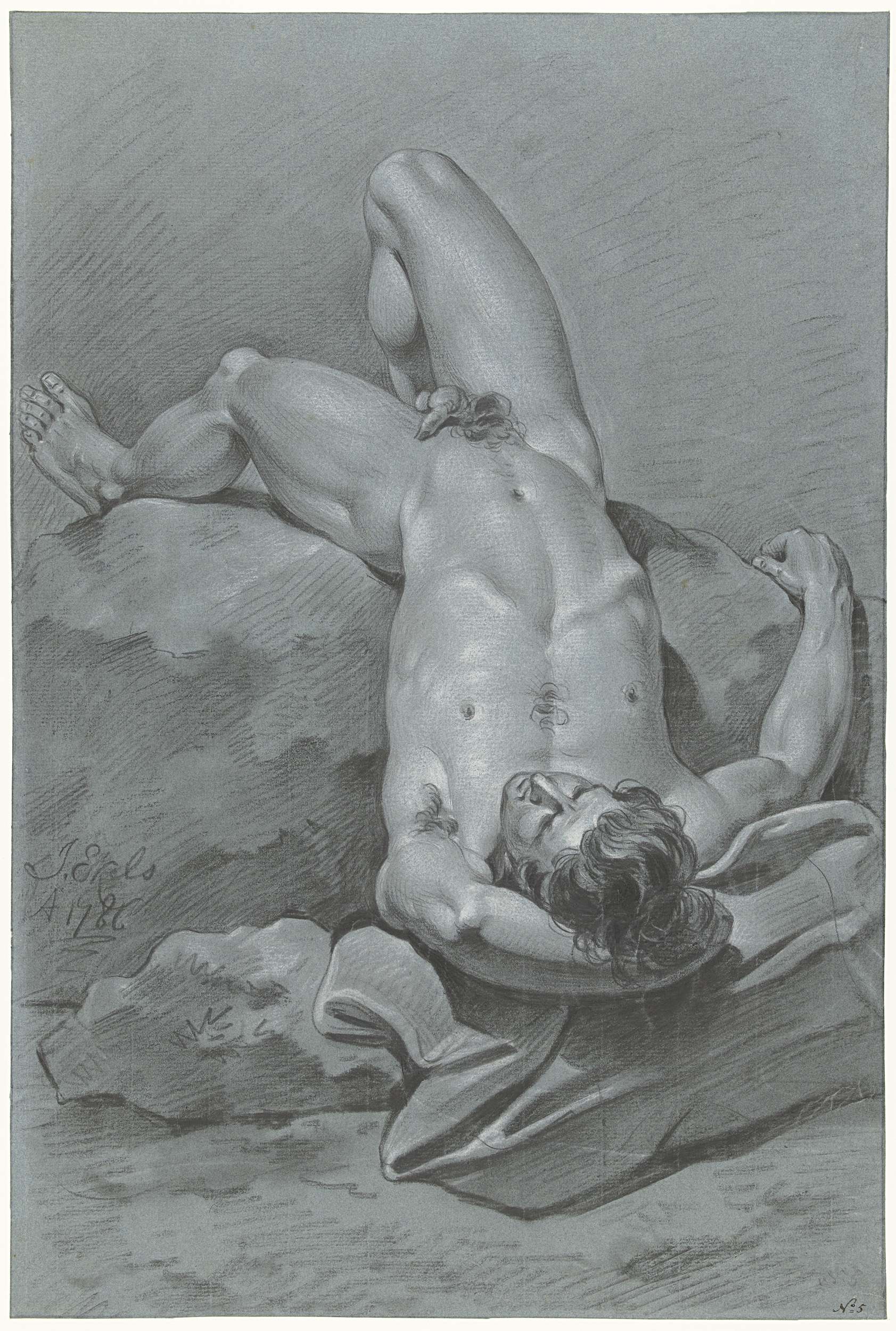 Studie van mannelijk naakt, achterover liggend op de rug