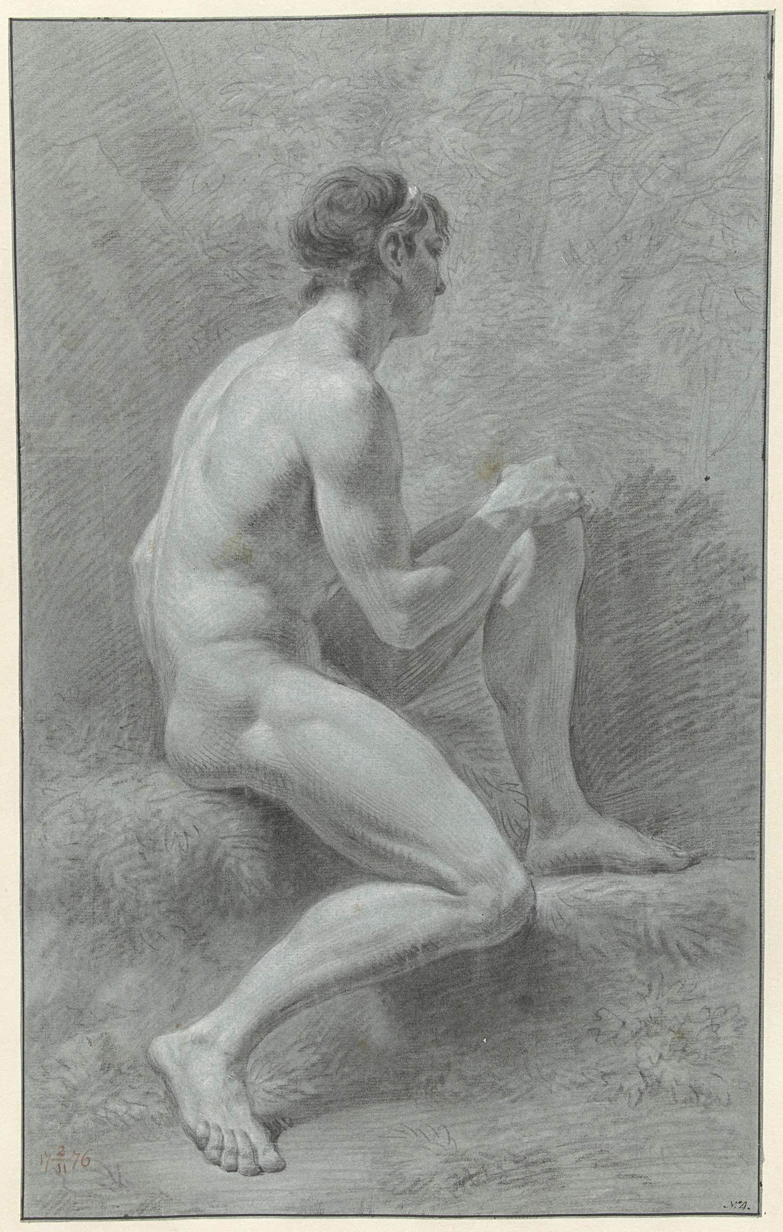 Zittend mannelijk naakt met opgetrokken knie, van opzij, naar rechts