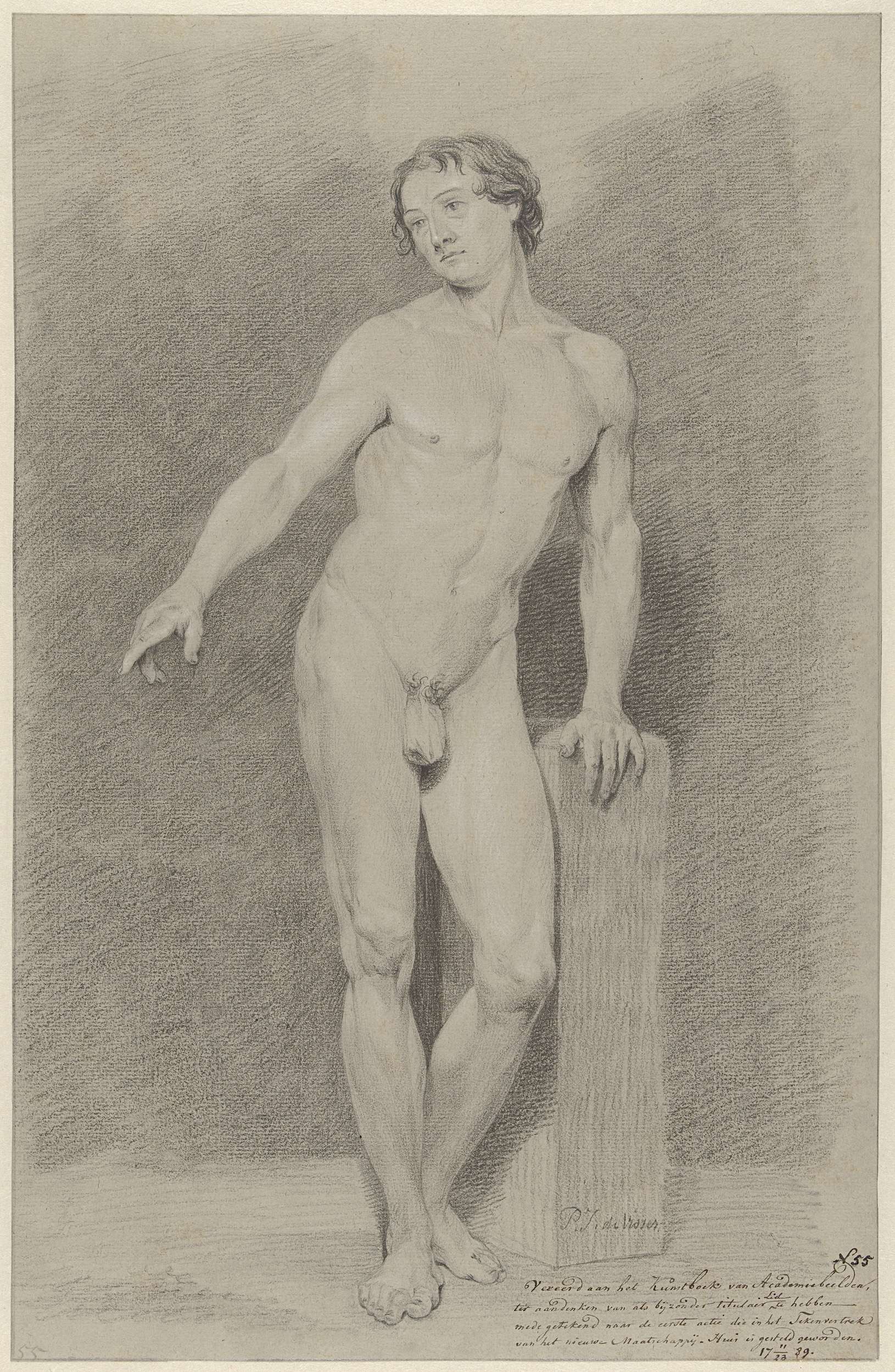 Staand mannelijk naakt, de rechterarm uitgestrekt, naar links. Opschrift: Vereerd aan het Kunstboek van Academiebeelden / ter aandenken van als bijzonder Titulair lid te hebben / mede getekend naar de eerste actie die in het Tekenvertrek / van het nieuwe Maatschappij-Huis is gesteld geworden / 17 11/23 89