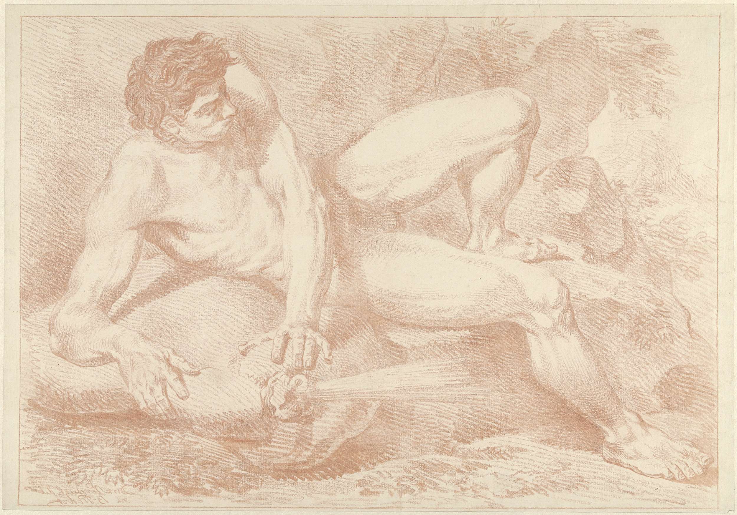 Liggend mannelijk naakt met gebolde wangen, leunend op een zak waaruit lucht blaast. Studie voor Aeolus (?)