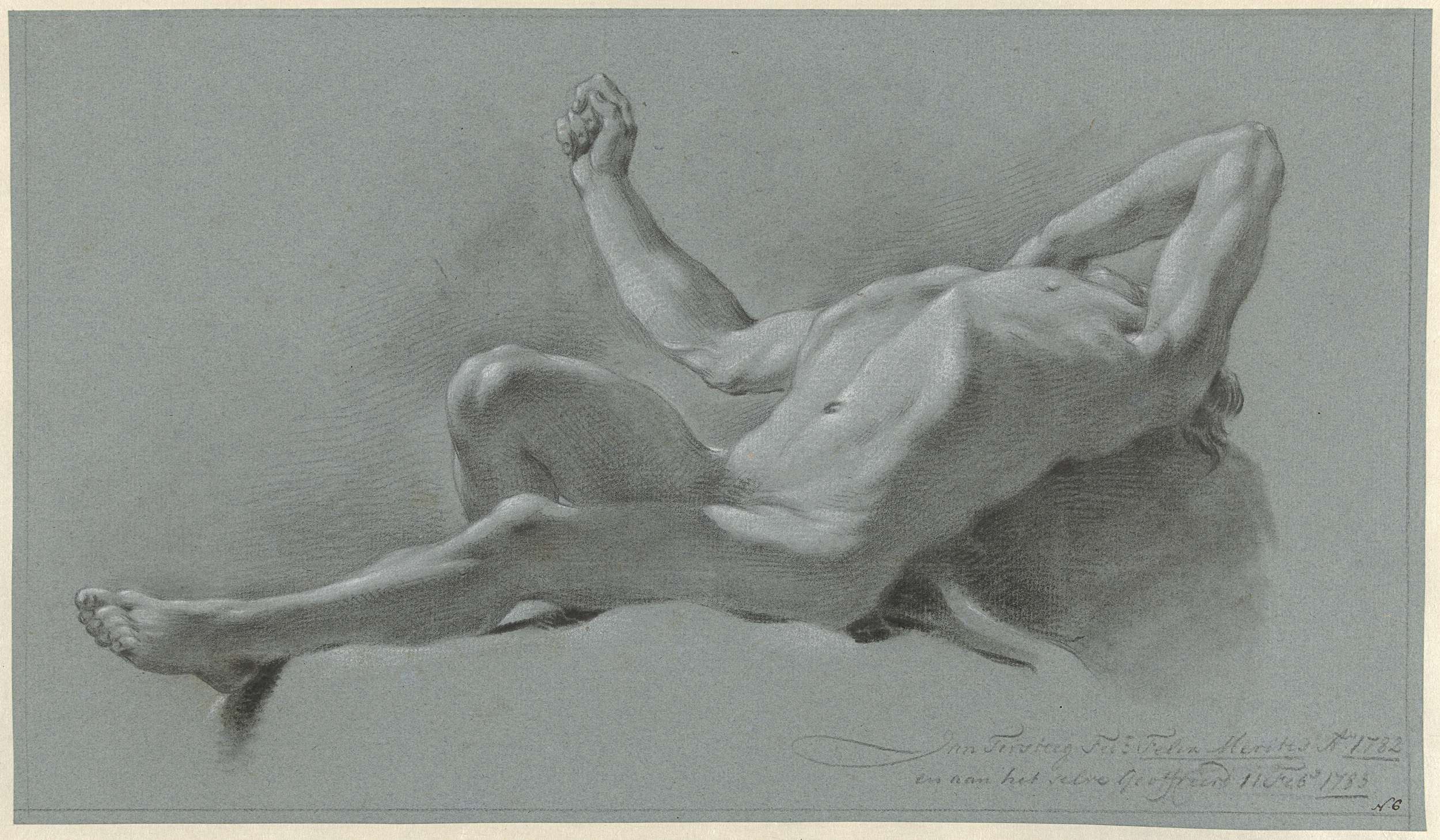 Liggend mannelijk naakt, op de rug, het hoofd ver achterover