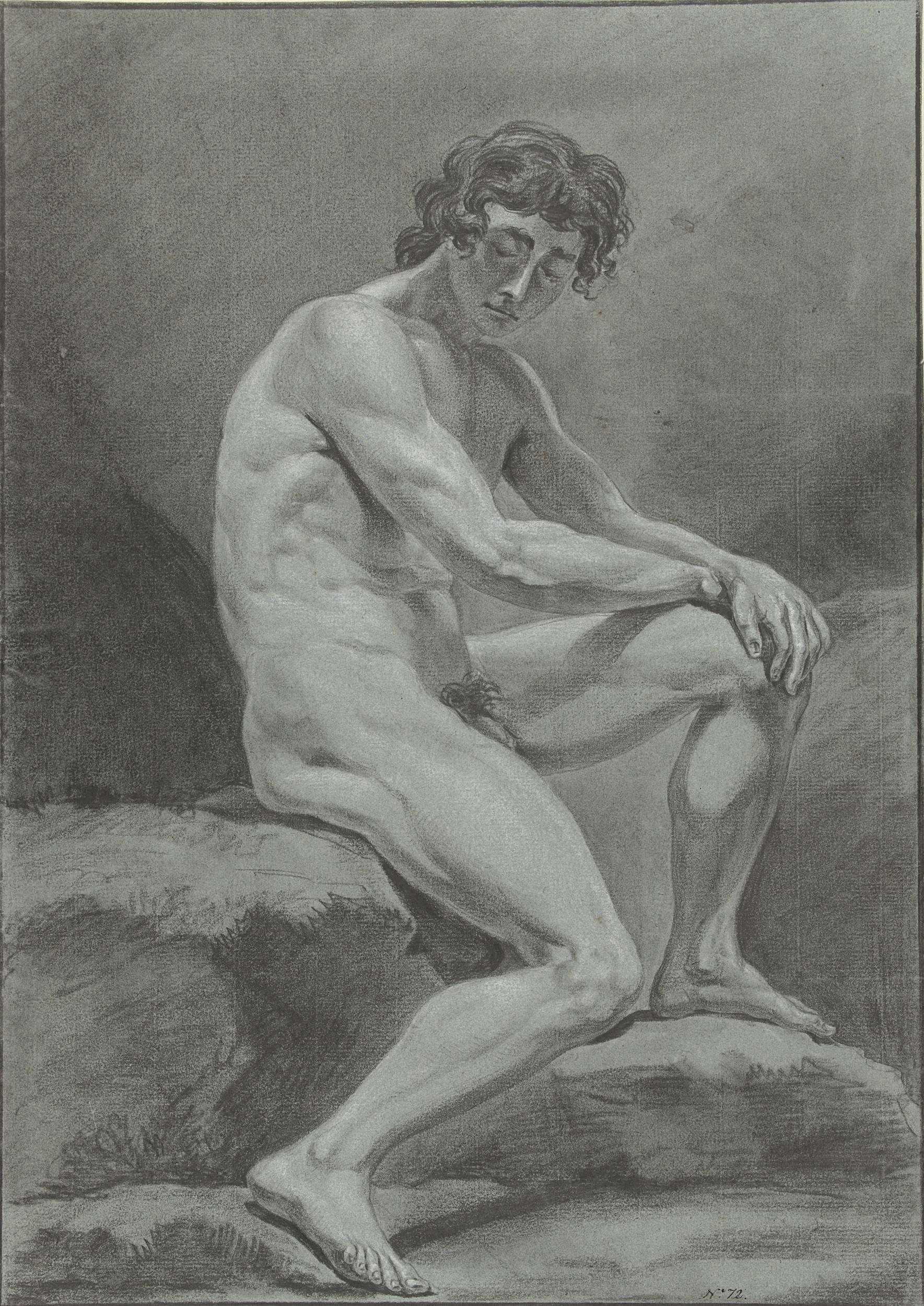 Zittend mannelijk naakt, van opzij gezien, naar rechts
