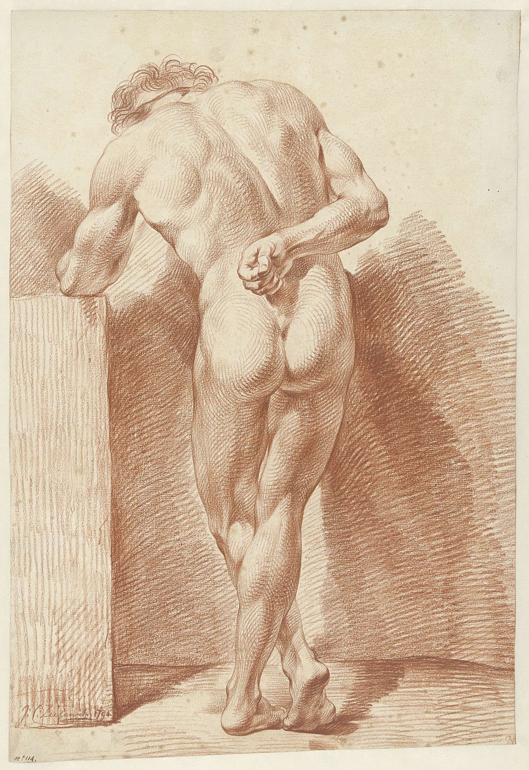 Staand mannelijk naakt, op de rug gezien, de rechterarm op de rug, de benen gekruist. Rechtsonder: no. 114.