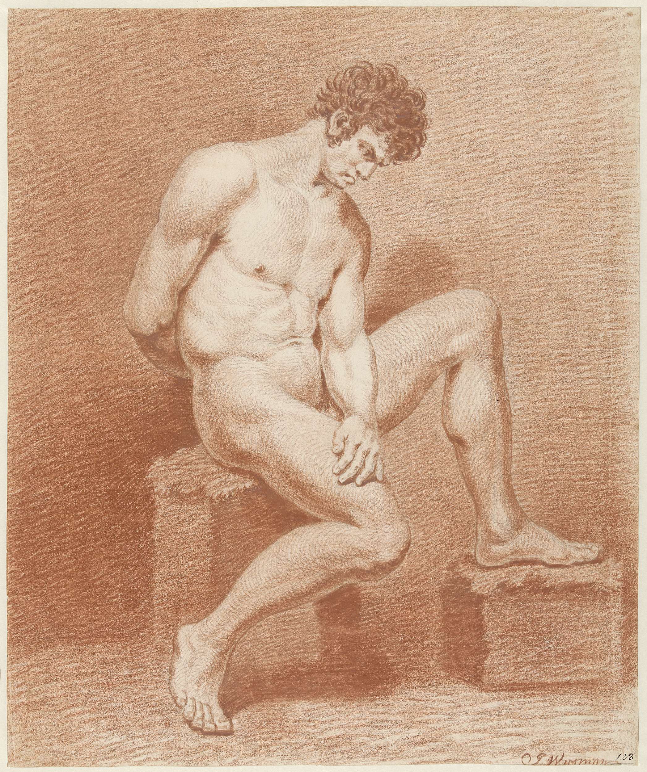 Zittend mannelijk naakt, naar rechts. Rechtsonder: no 128.