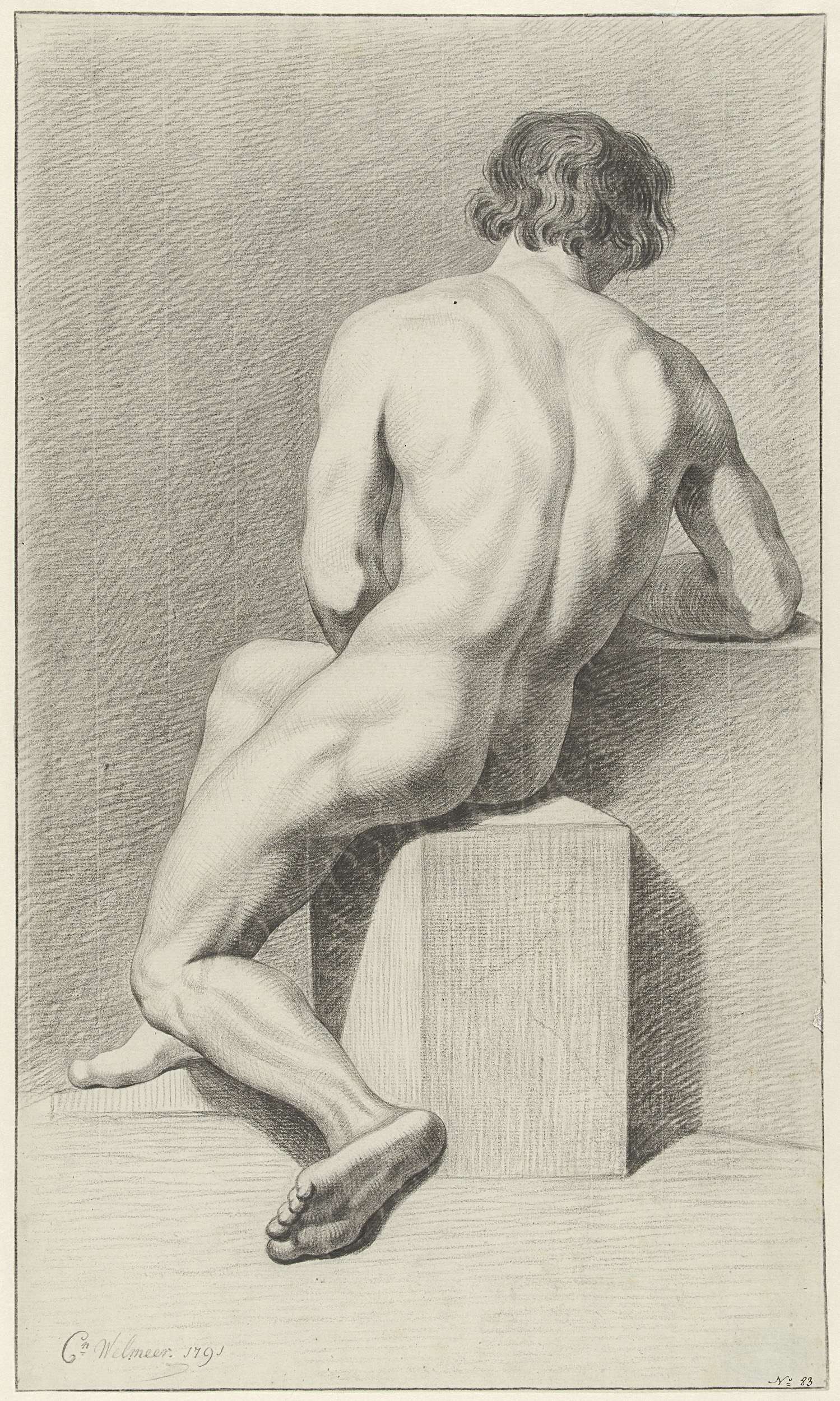 Zittend mannelijk naakt, op de rug gezien. Linksonder: no. 83.