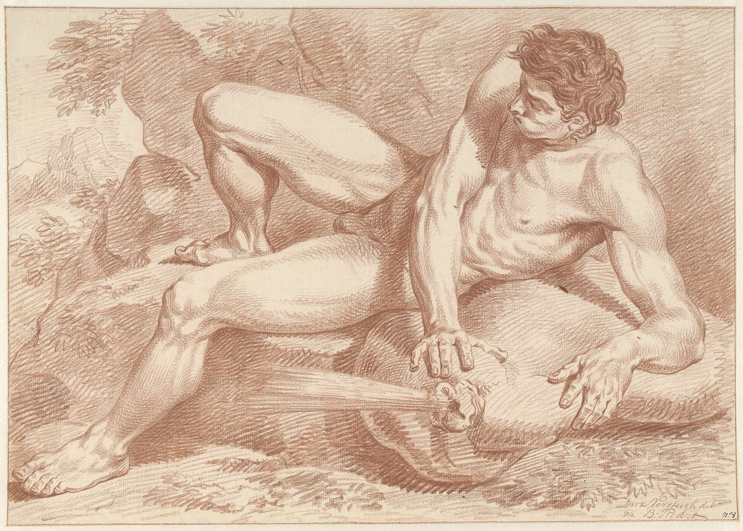 Liggend mannelijk naakt, op een zak waaruit lucht blaast