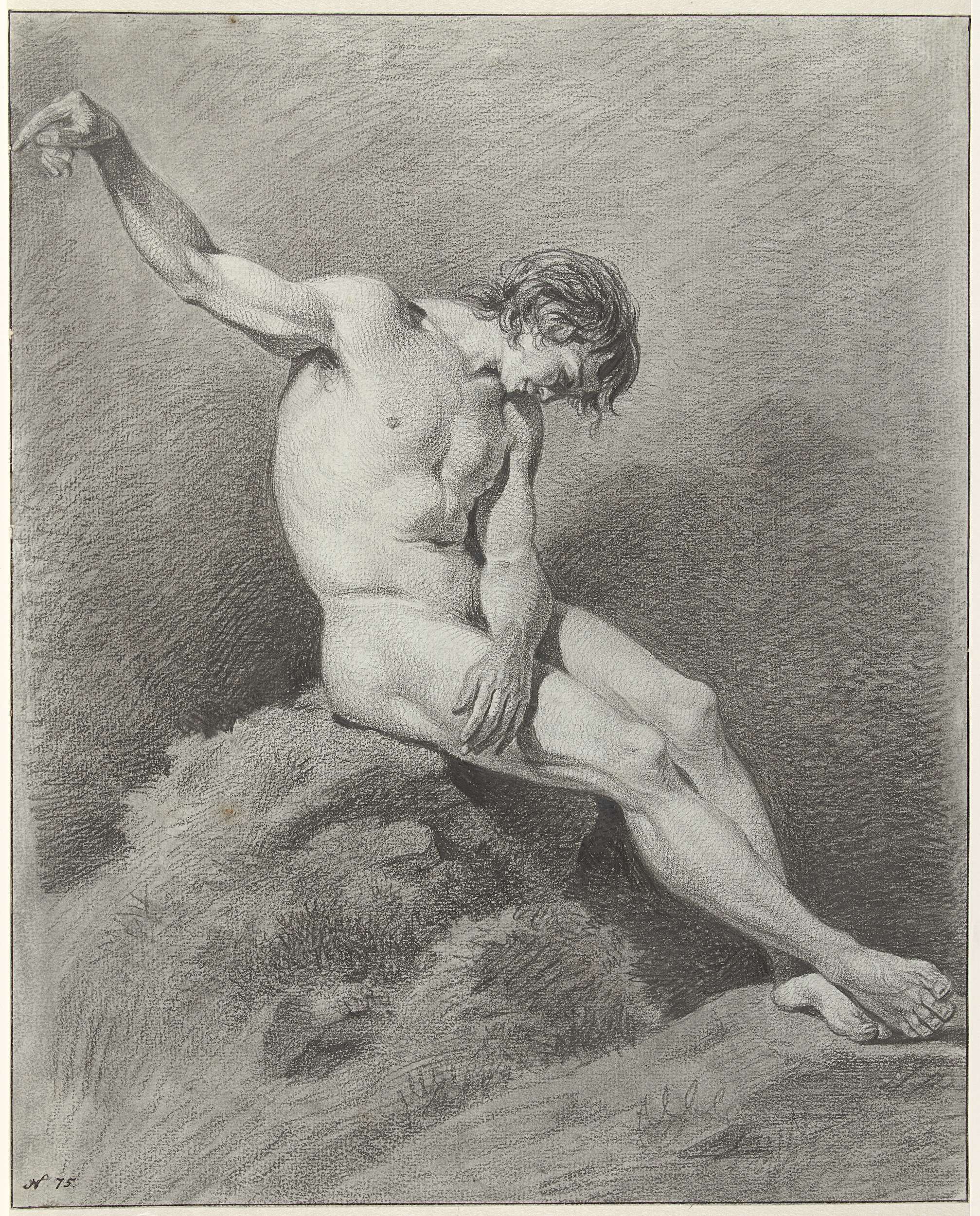 Zittend mannelijk naakt. Opschrift: no. 75.