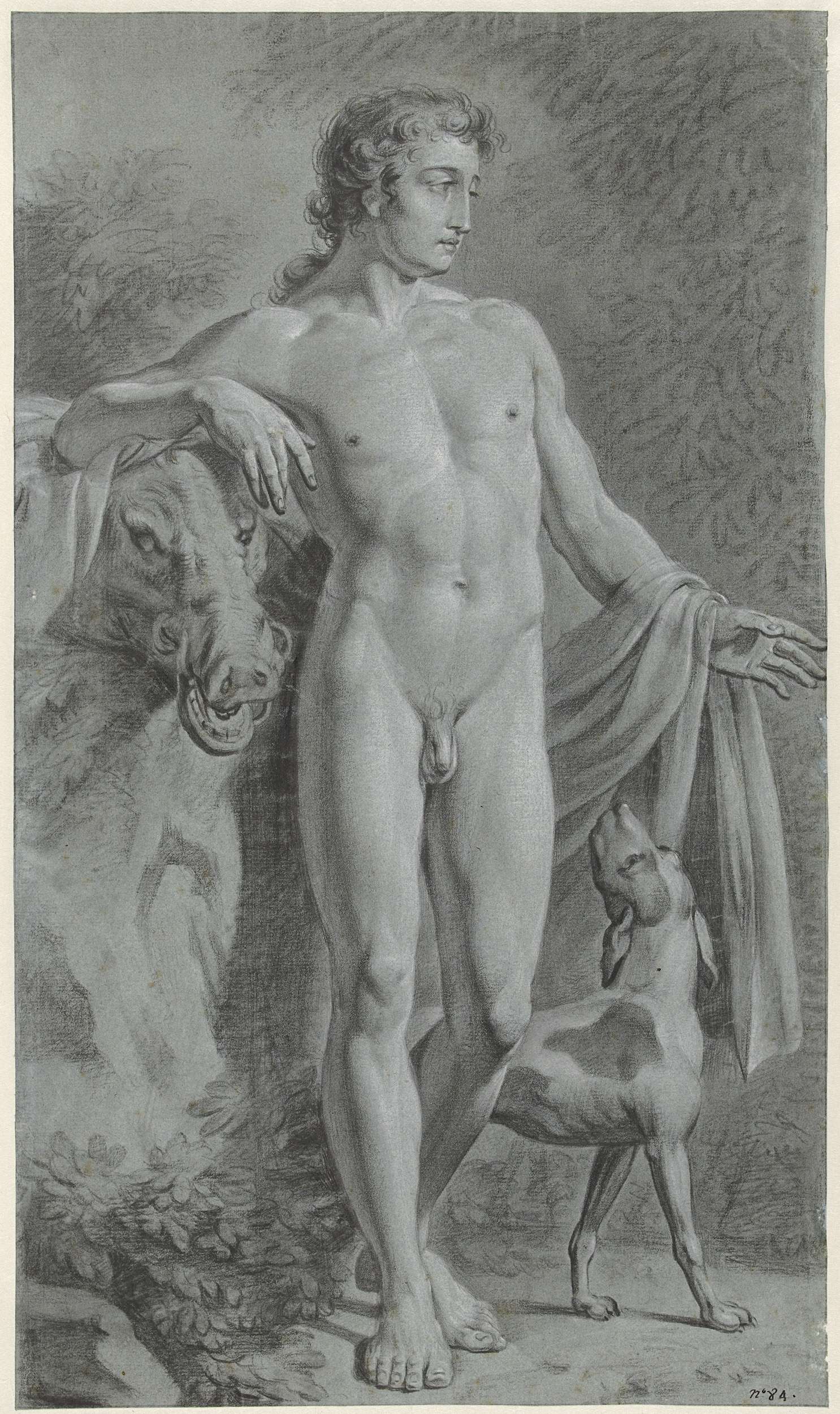 Staand mannelijk naakt met een hond en de kop van een everzwijn. Nr. 84.