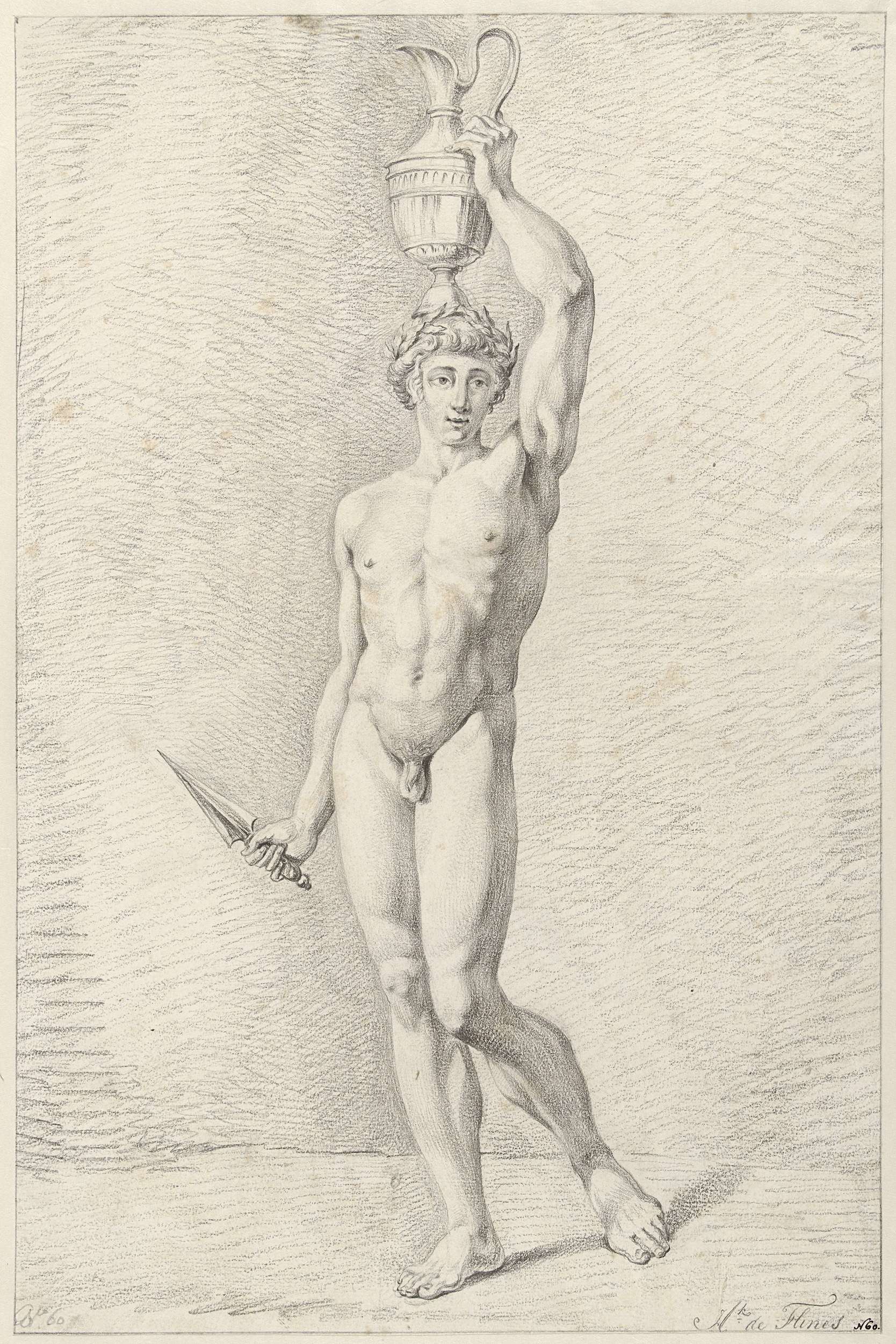Staand mannelijk naakt met een vaas op het hoofd en een mes in de rechterhand. No. 60.