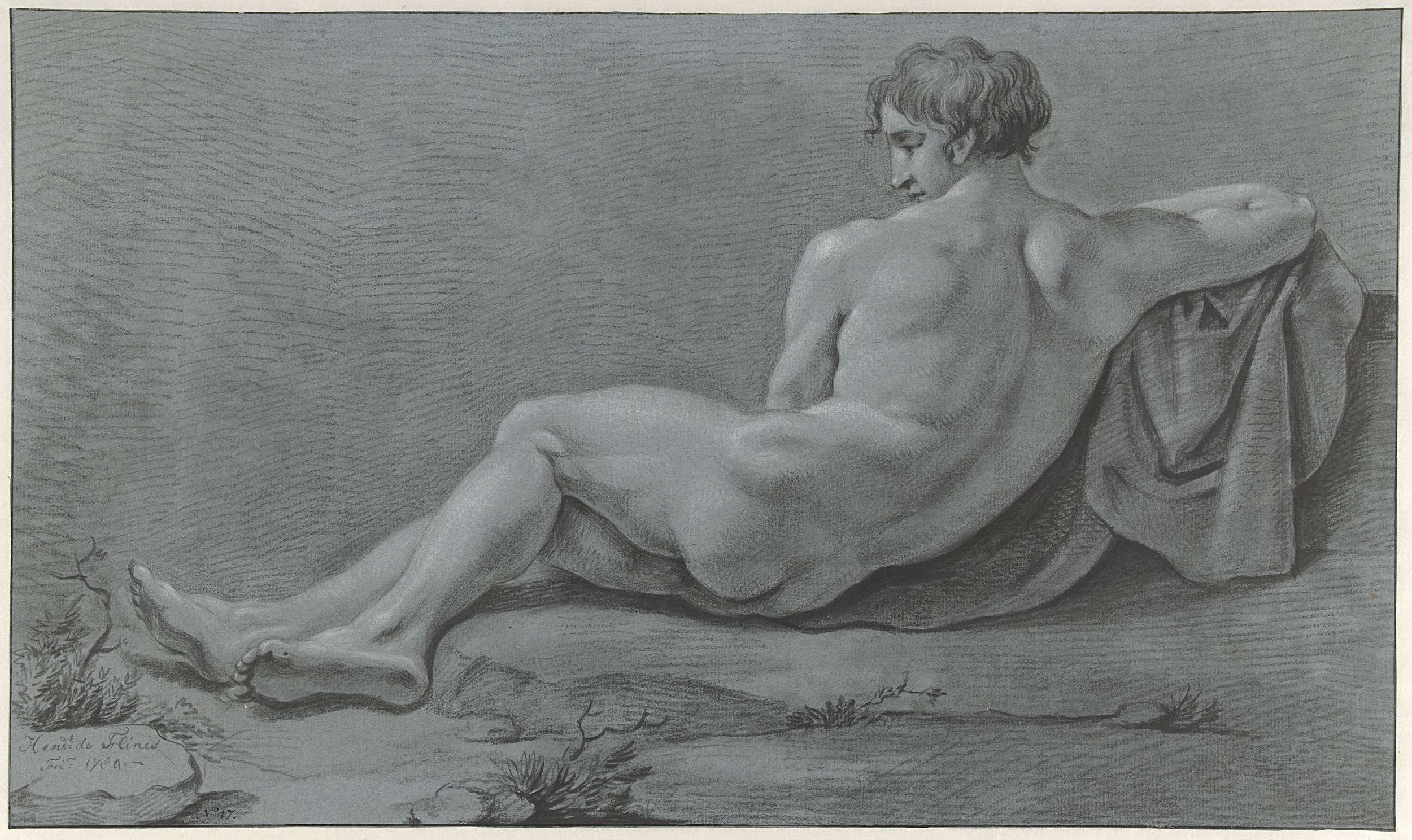Liggend mannelijk naakt, op de rug gezien. No. 17.