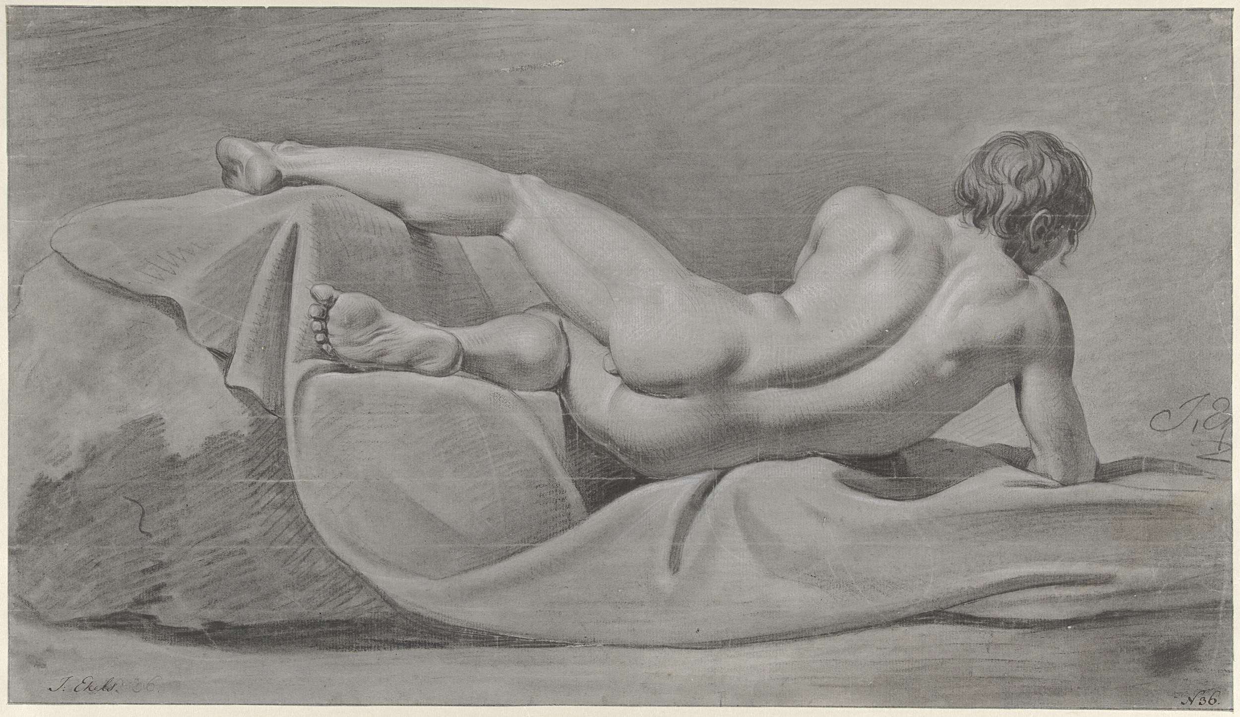 Liggend mannelijk naakt, op de rug gezien. Nr. 36.