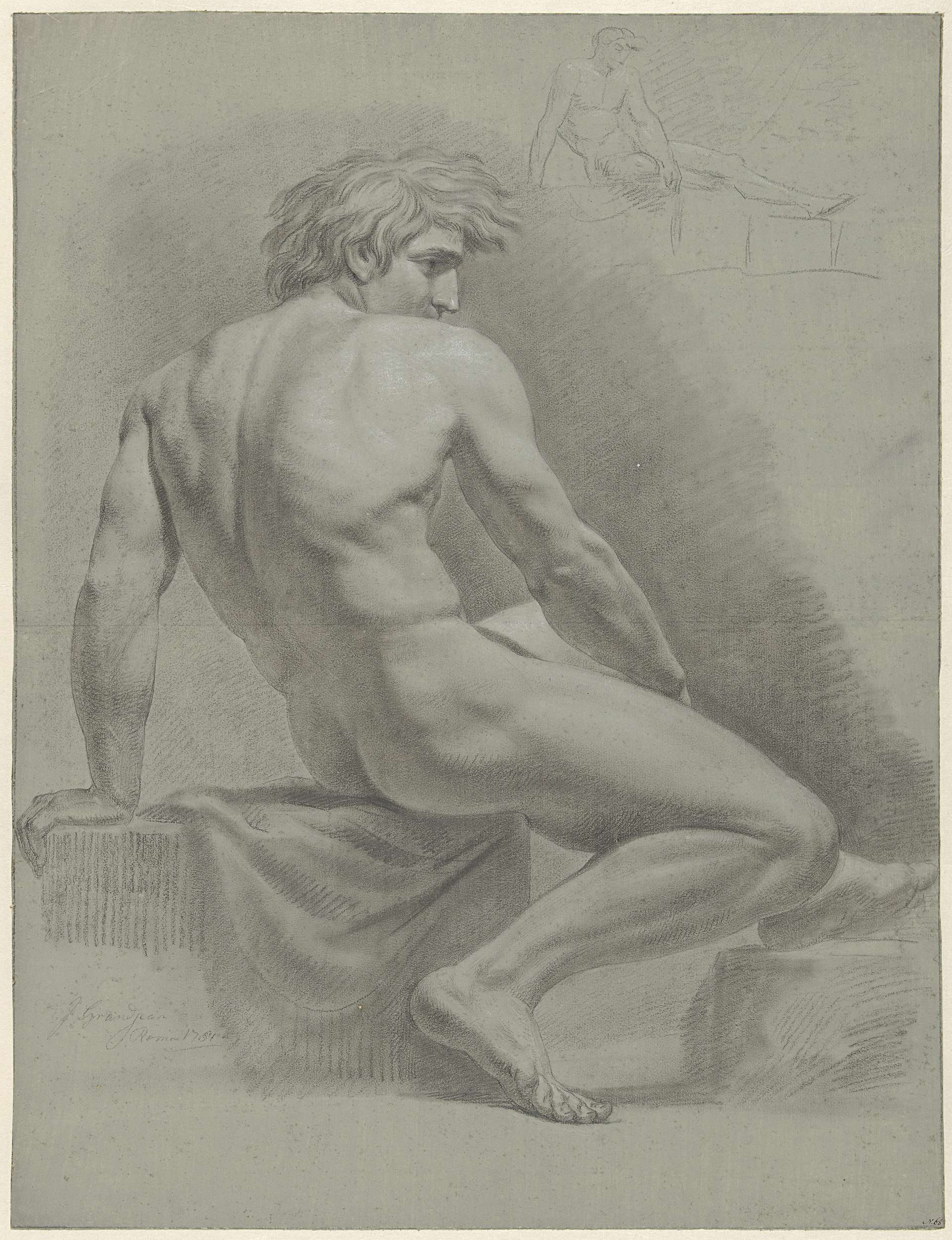 Zittend mannelijk naakt, naar rechts; boven een tweede, kleine schets.