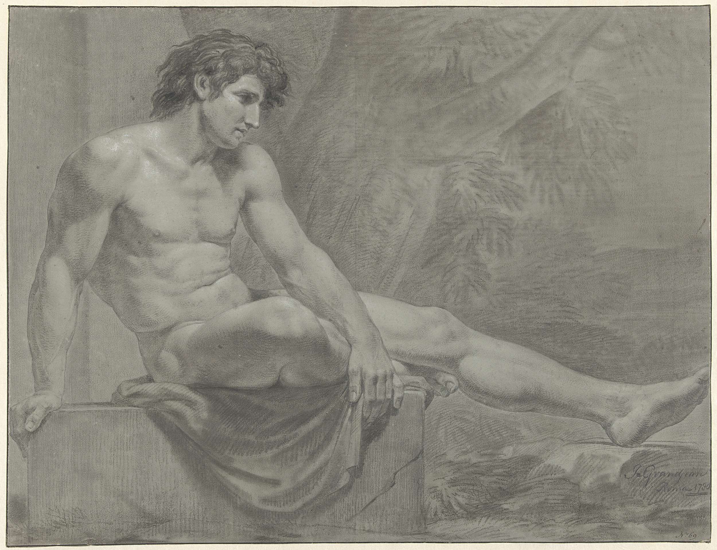 Zittend mannelijk naakt, naar rechts met gestrekt linkerbeen, op de achtergrond een boom.