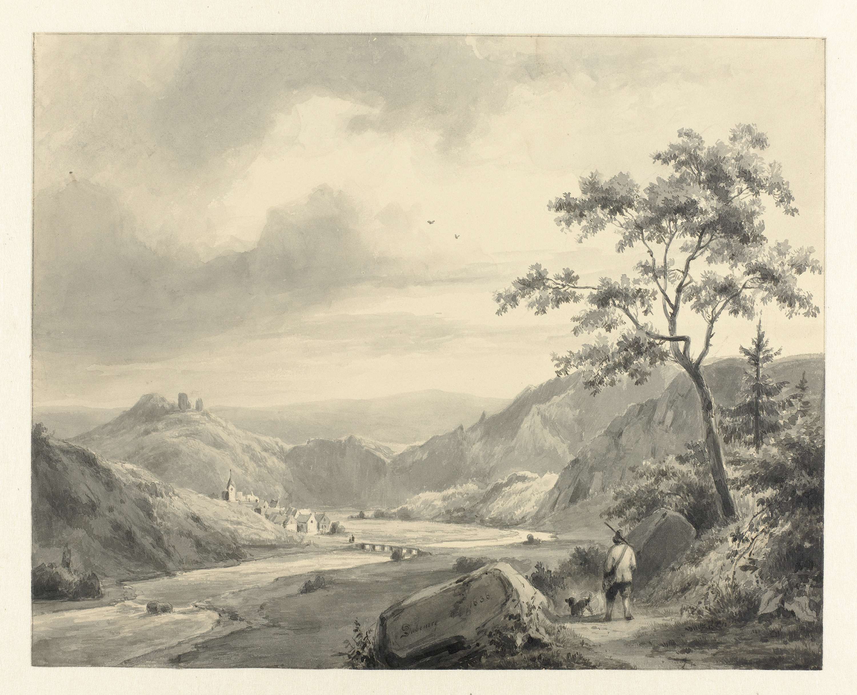 Heuvellandschap met jager met hond op pad