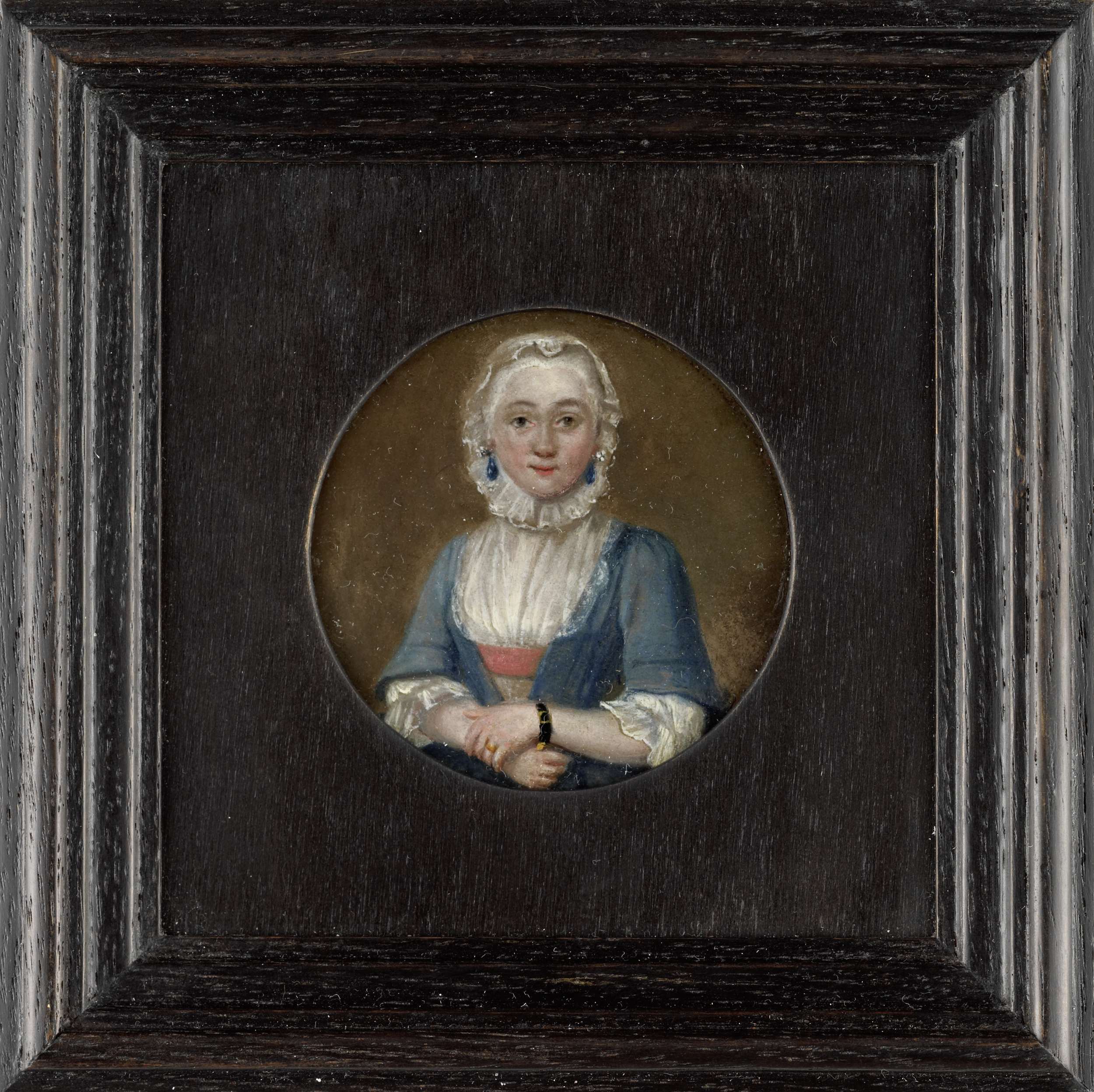 Portret van een vrouw. Ten halven lijve, aanziend. Met een witte muts en een zwarte polsband, de armen over elkaar voor de buik. Onderdeel van de collectie portretminiaturen.