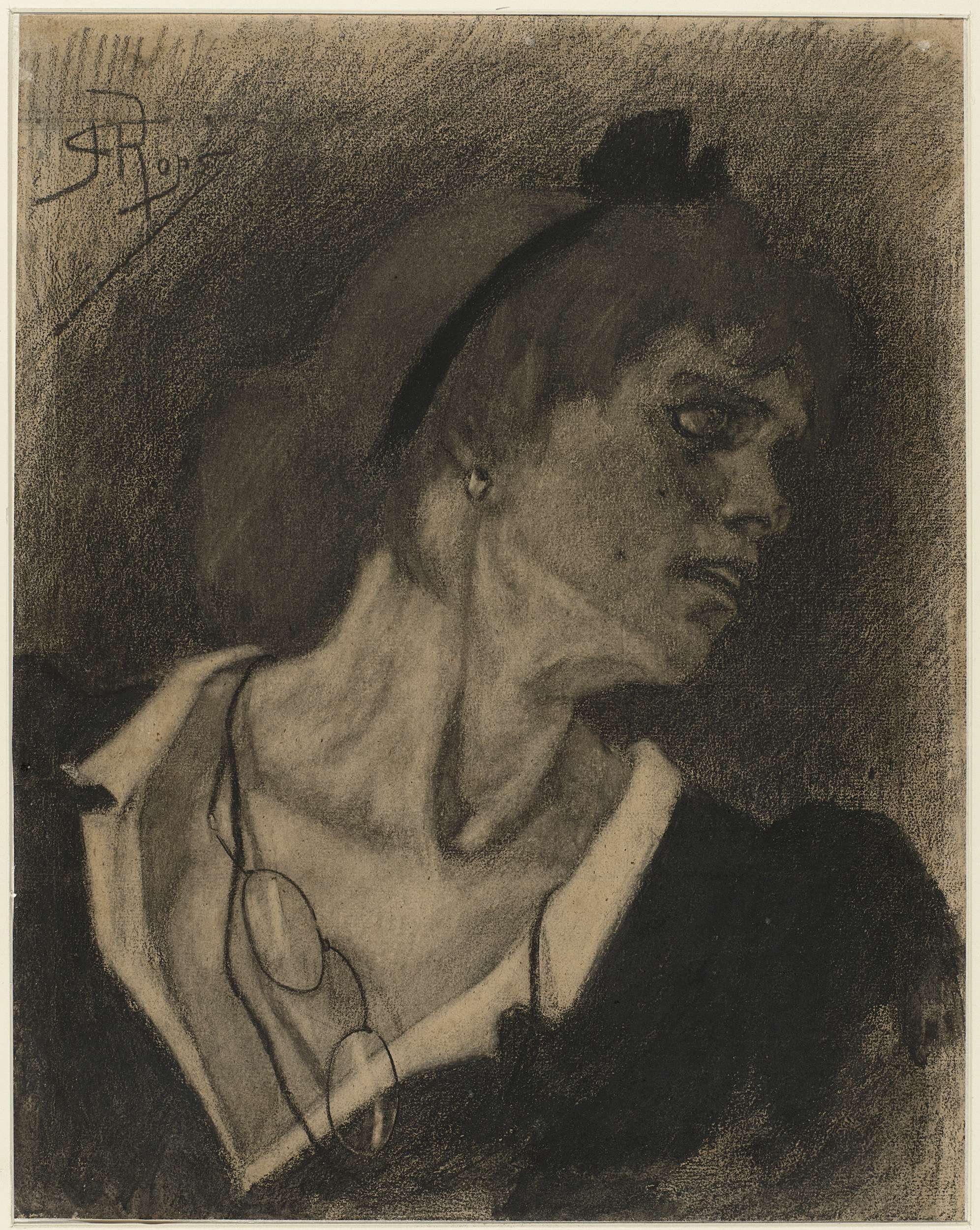 Borstbeeld van een vrouw met lorgnet aan een snoer om de hals