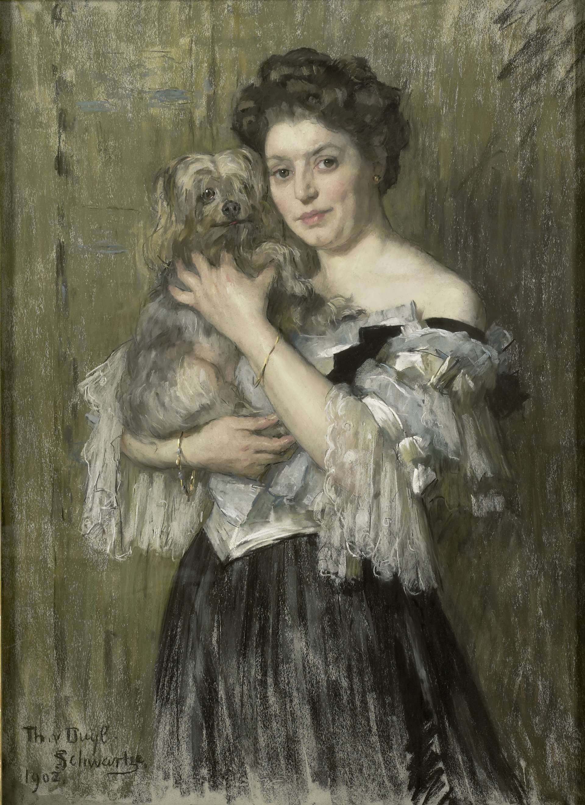 Portret van Maria Catharina Josephine Jordan (1866-1948). Jordan is hoedenmaakster en model geweest. In 1901 trouwde ze met schilder George Hendrik Breitner. Kniestuk, staande, aanziend, met een pekineesje in de armen. Onderdeel van de collectie pastels.