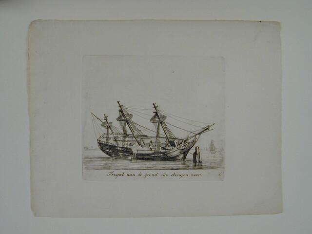 Prent van een fregatschip met geschoten stengen aan de grond. Uit de suite 'Verscheide Soorten van Schepen en Vaartuijgen', nummer 5.