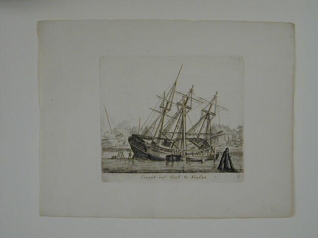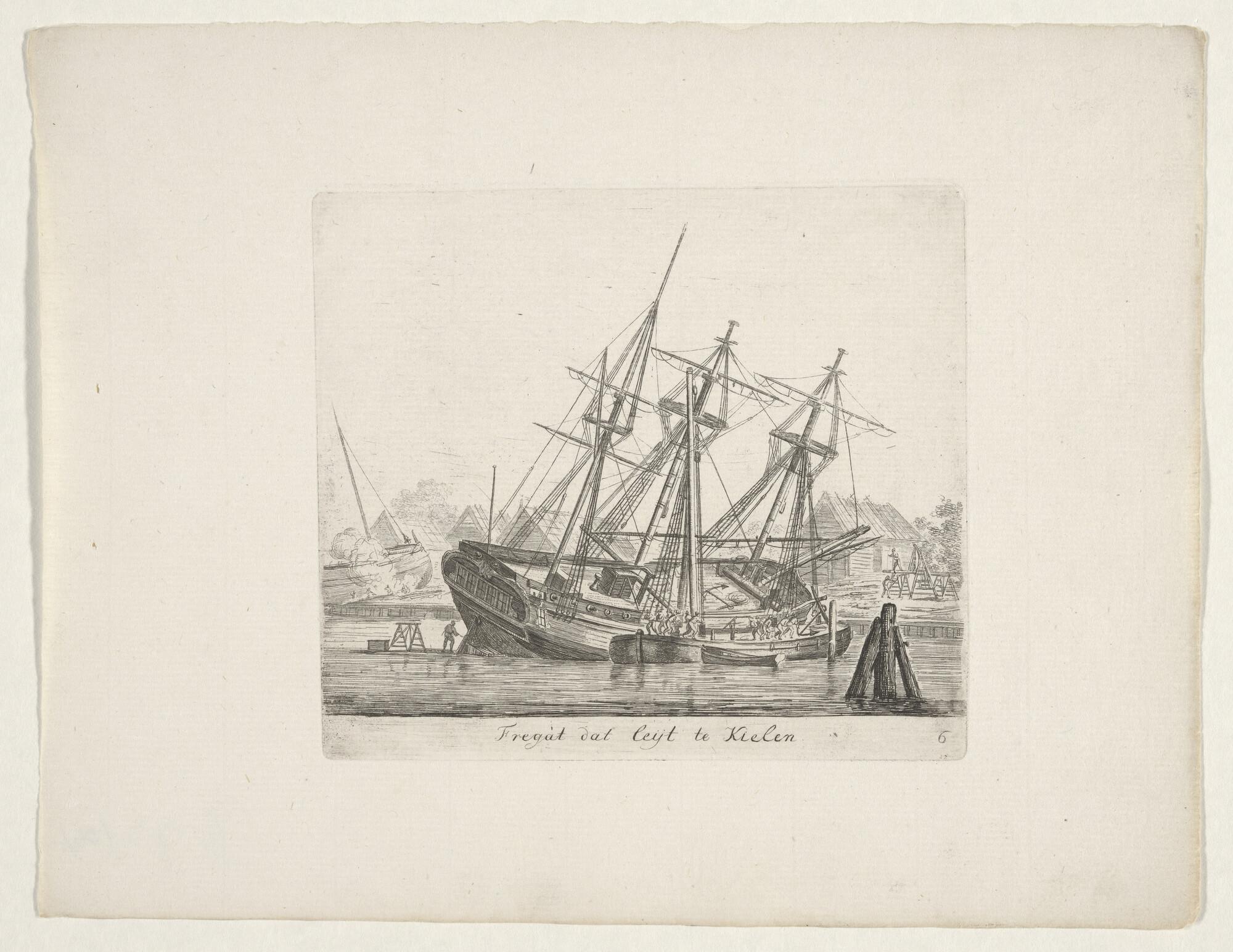 Prent van het kielen van een fregatschip. Uit de suite 'Verscheide Soorten van Schepen en Vaartuijgen', nummer 6.