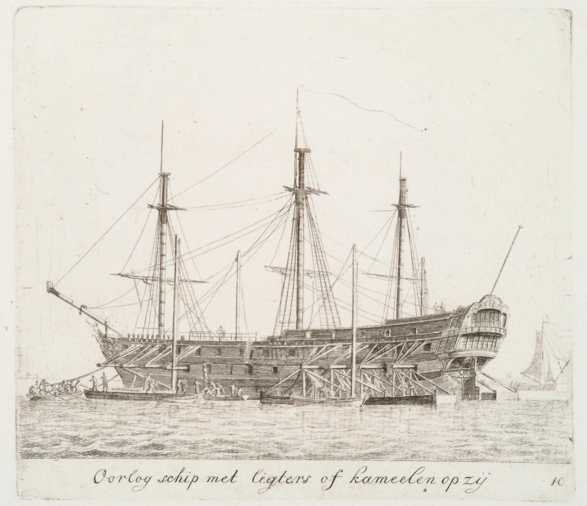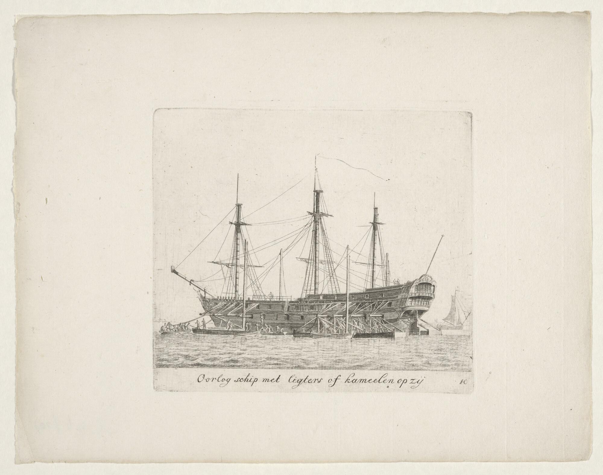 Prent van een oorlogsschip op kamelen. Uit de suite 'Verscheide Soorten van Schepen en Vaartuijgen', nummer 10.