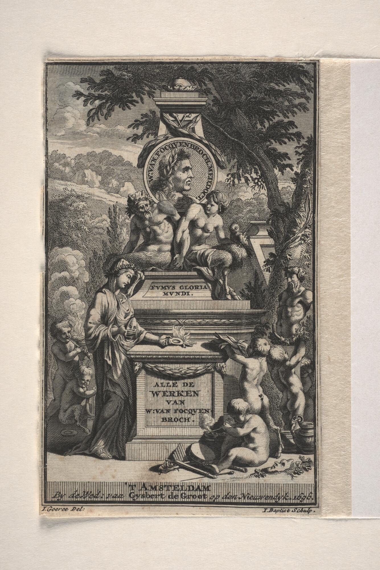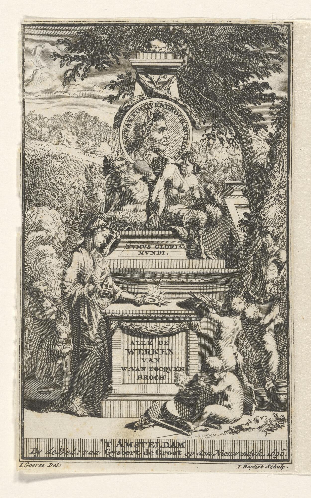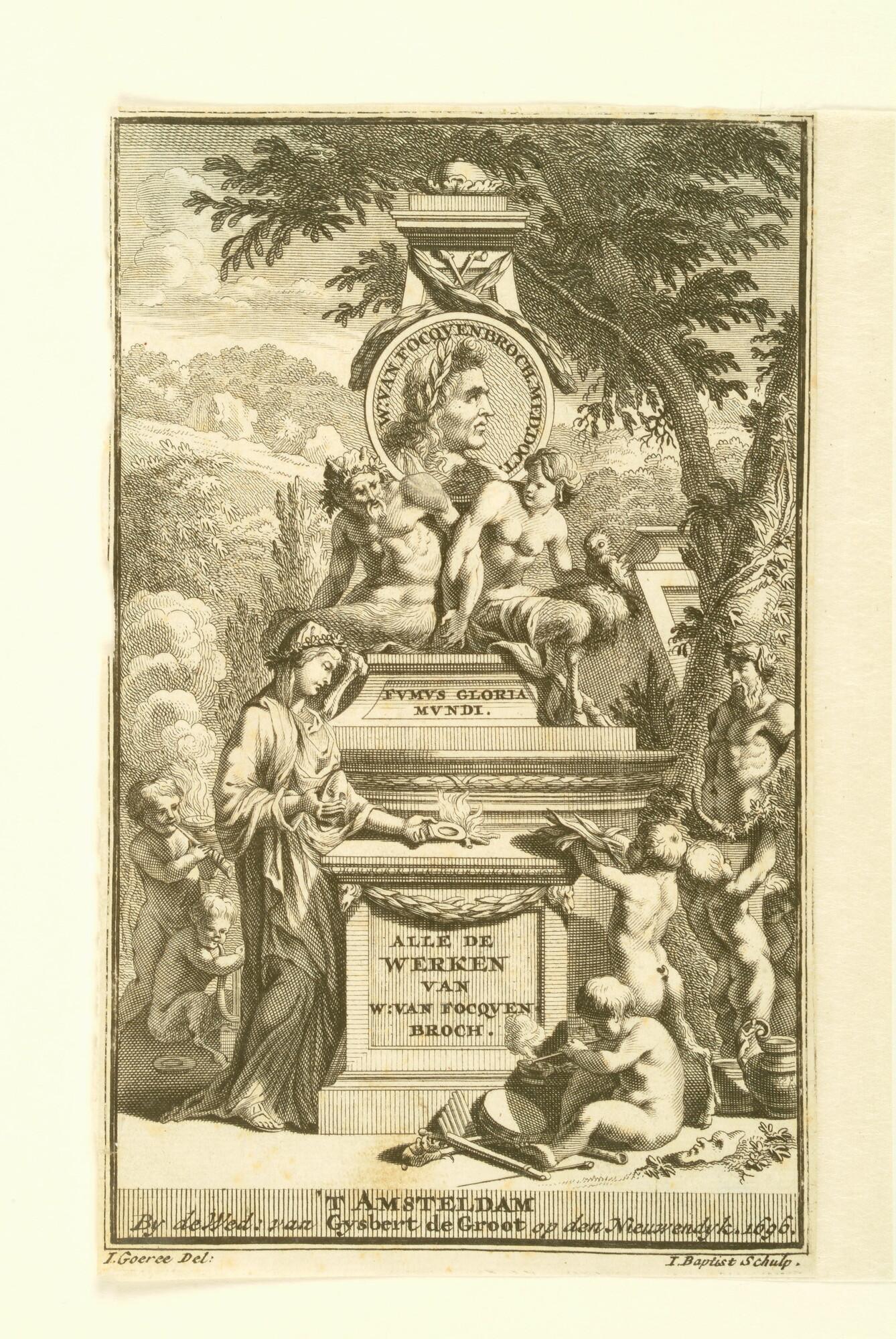 Voorstelling van een monument voor W.G. van Focquenbroch, arts, dichter en dienaar van de WIC. Titelblad uit een boekje uitgegeven bij de Wed. van Gijsb. de Groot te Amsterdam.
