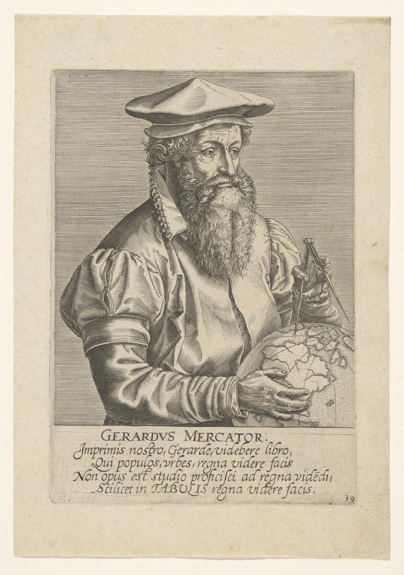 Portret van cartograaf Gerardus Mercator met globe en passer.