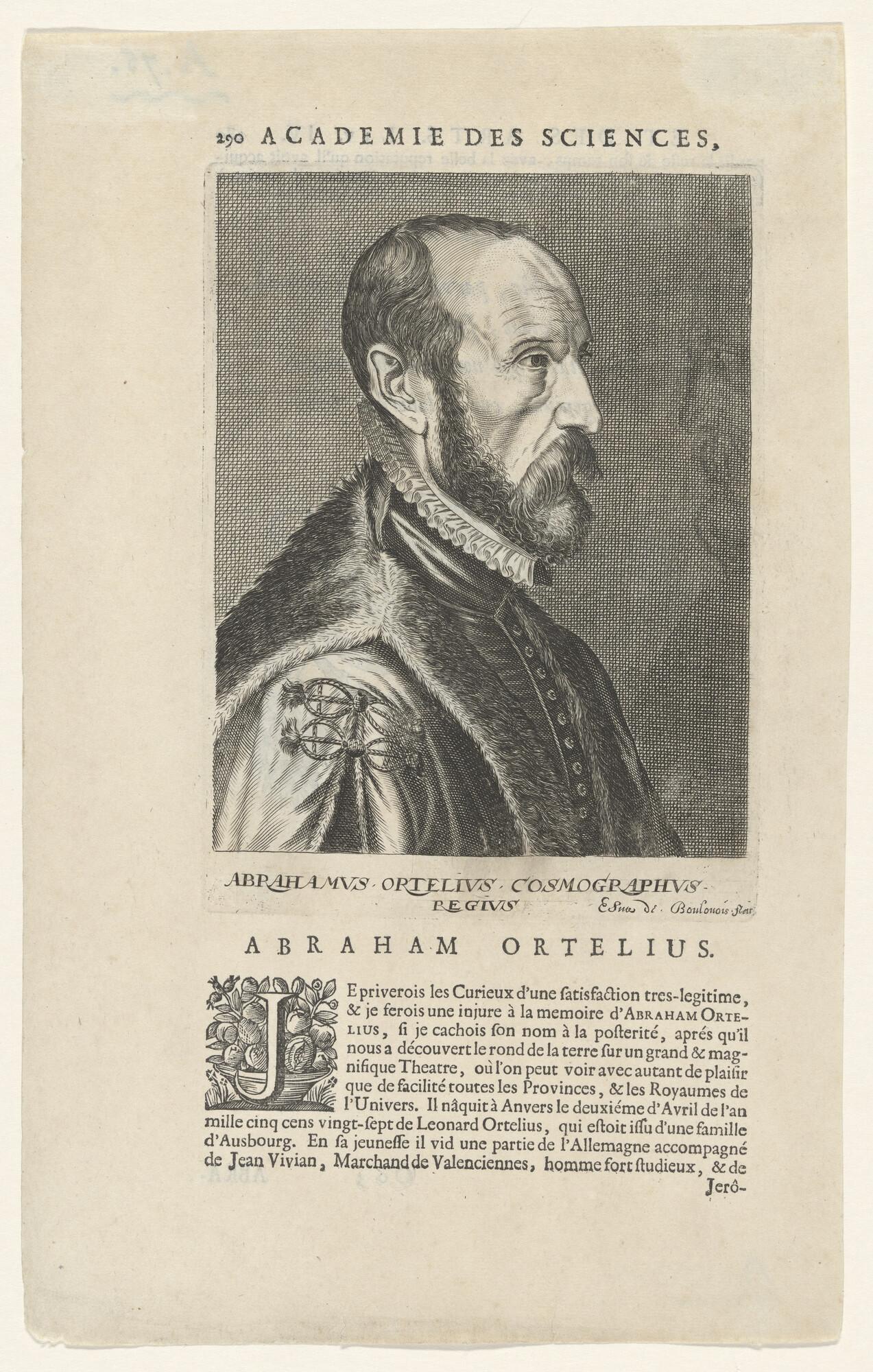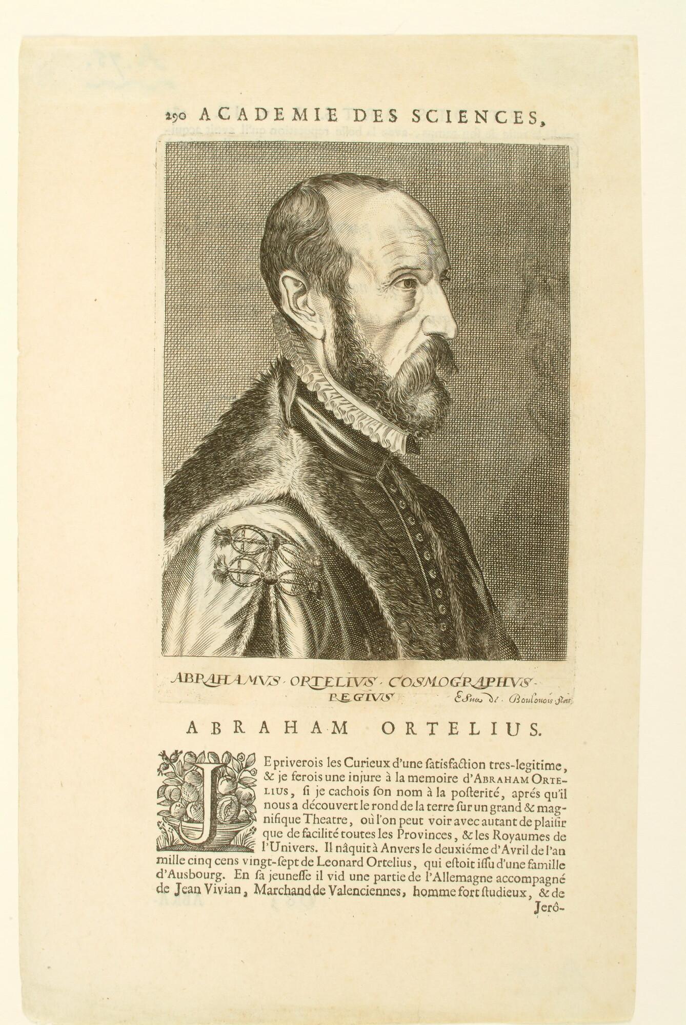 Portret van cartograaf Abraham Ortelius. Bladzijde 290 uit de Academie des Sciences.