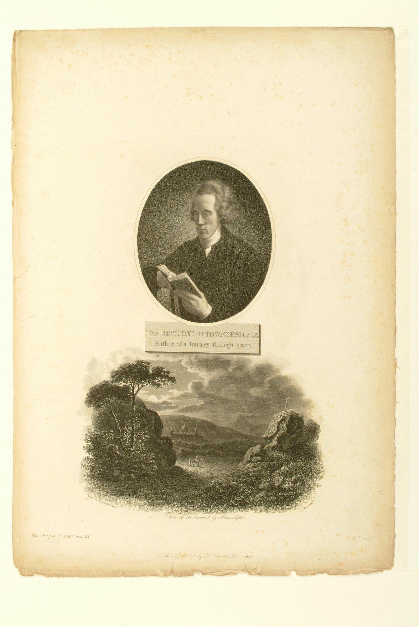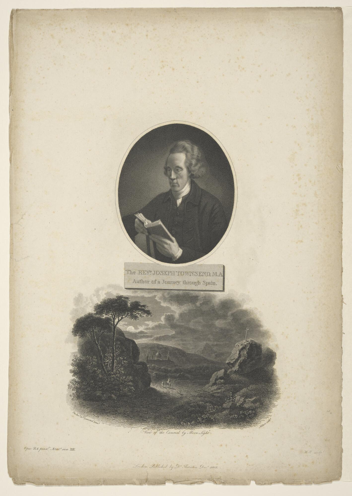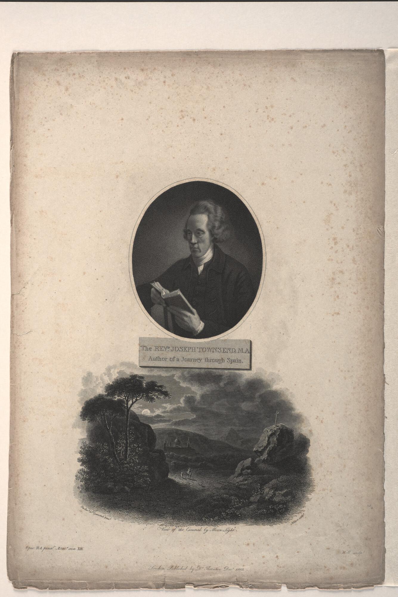Portret van Joseph Townsend met daaronder een gezicht op het Escurial bij maanlicht.